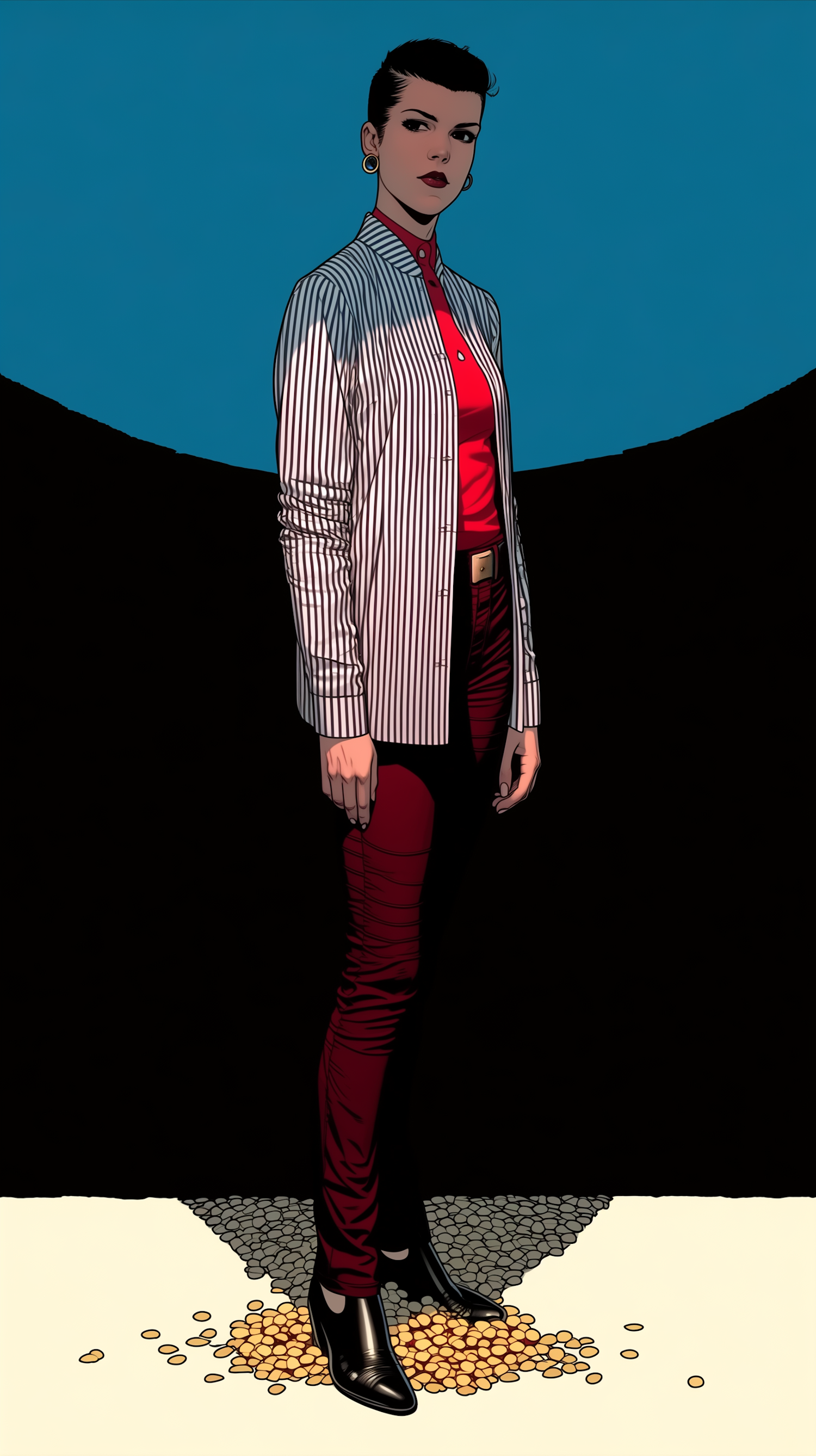 Stylized illustration of a person in a striped shirt and red top, standing confidently against a bold blue and black background.