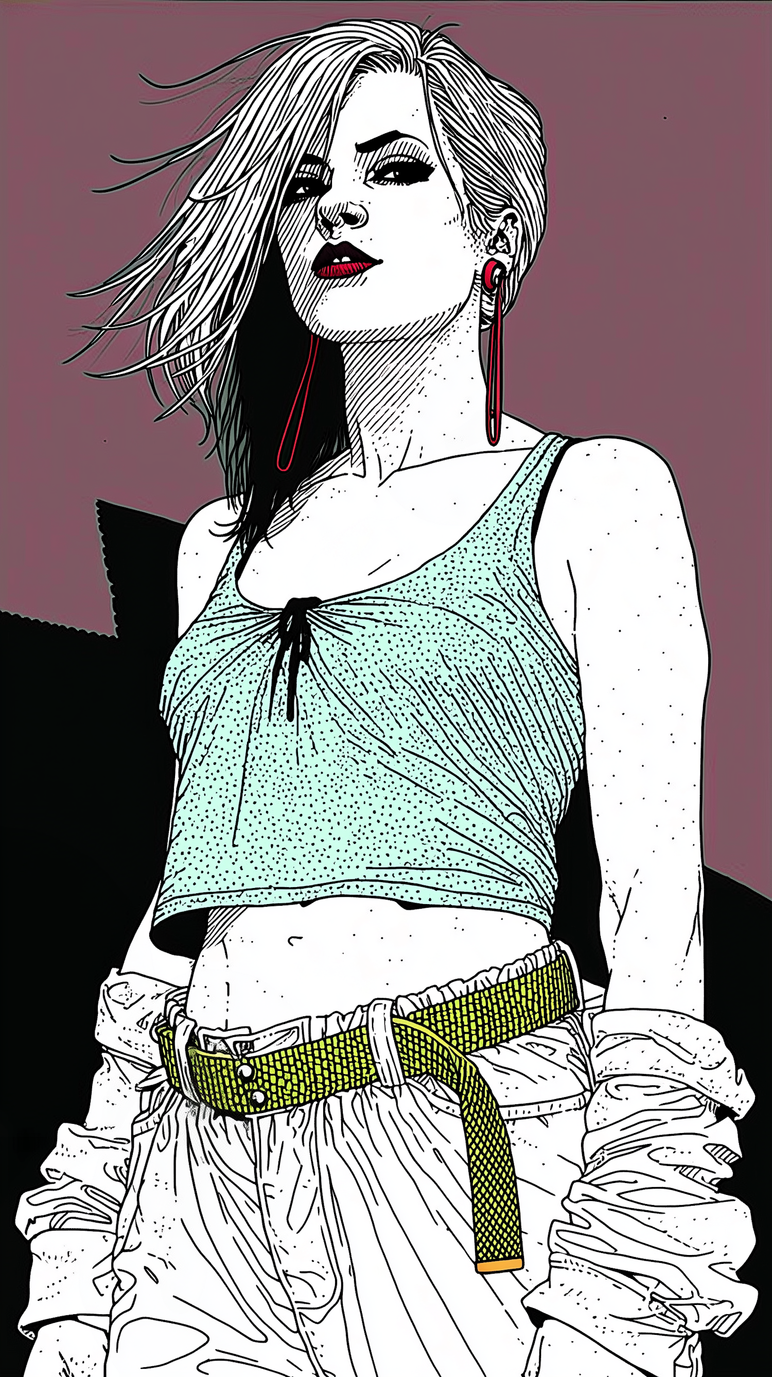 Stylized illustration of a confident woman with bold makeup, a green top, and loose pants, set against a muted maroon background.