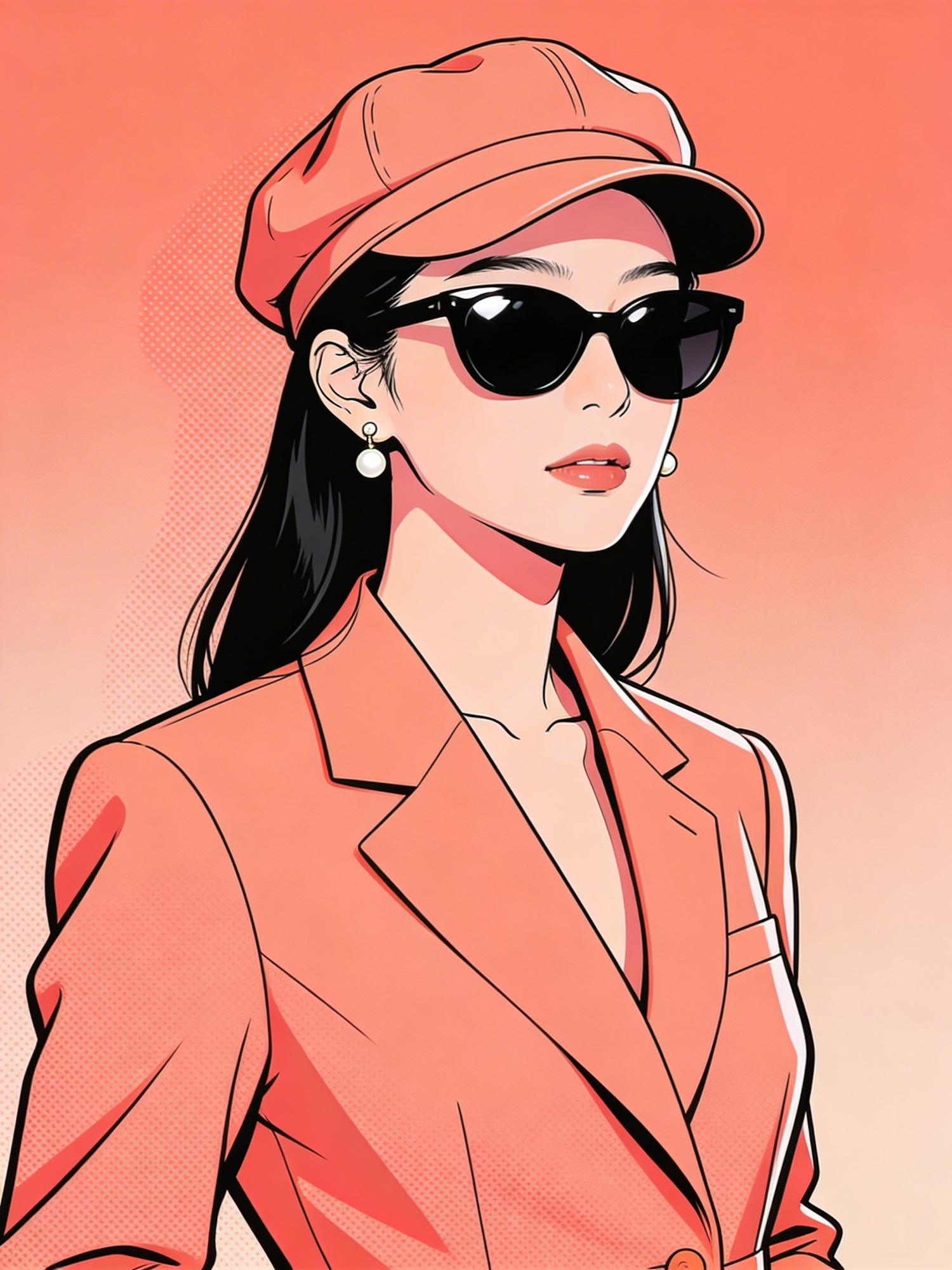 A high‑resolution stylised modern digital portrait of an East Asian woman standing confidently against a soft pastel-coral backdrop. She wears a coral blazer, matching cap, glossy black sunglasses, and small pearl earrings. The illustration features bold graphic shapes, smooth digital shading, and a contemporary character‑design feel, with warm pastel tones and a soft editorial glow that gives it a Pinterest‑viral modern aesthetic.