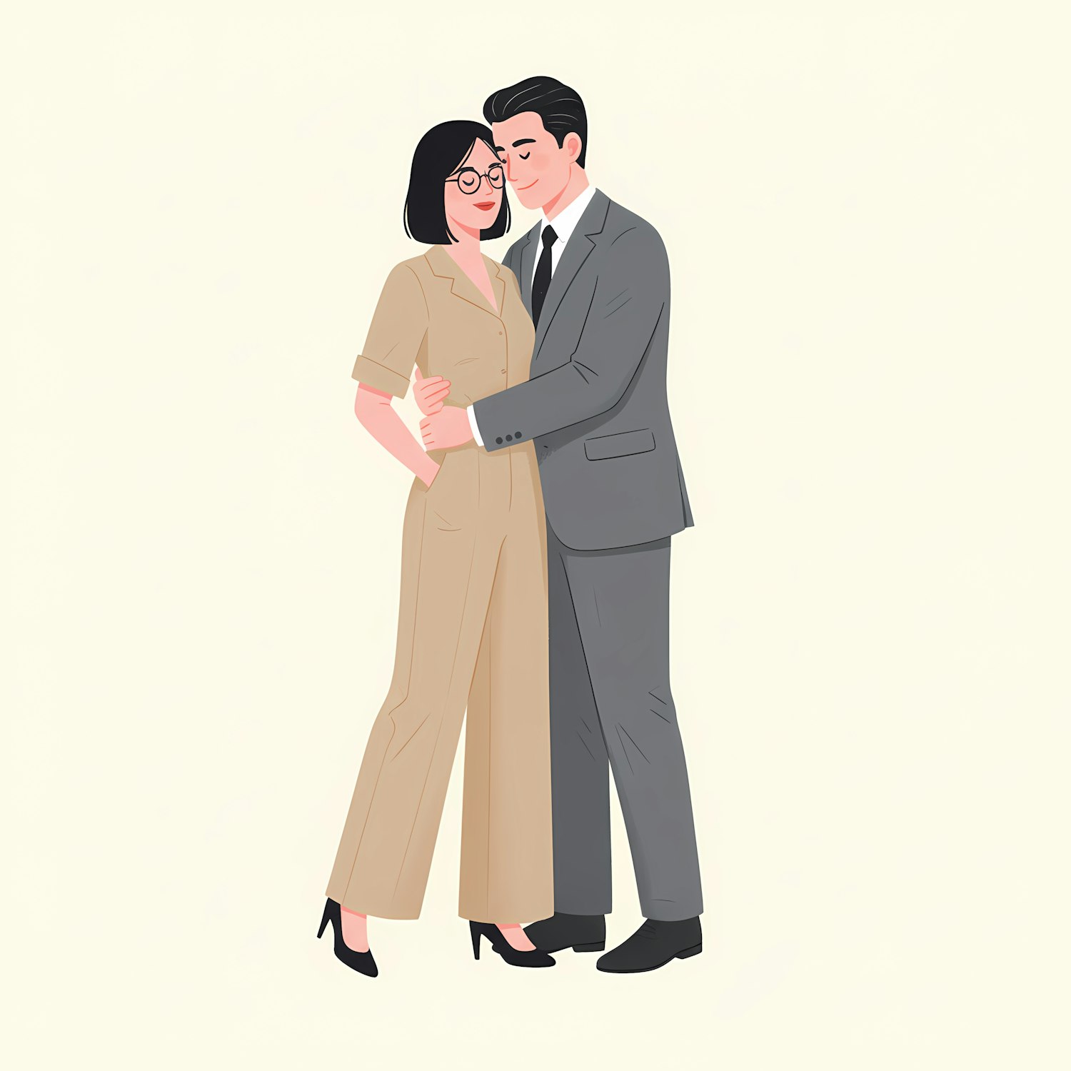 A charming illustration of a couple embracing, with the woman in a beige jumpsuit and the man in a gray suit, set against a light background.