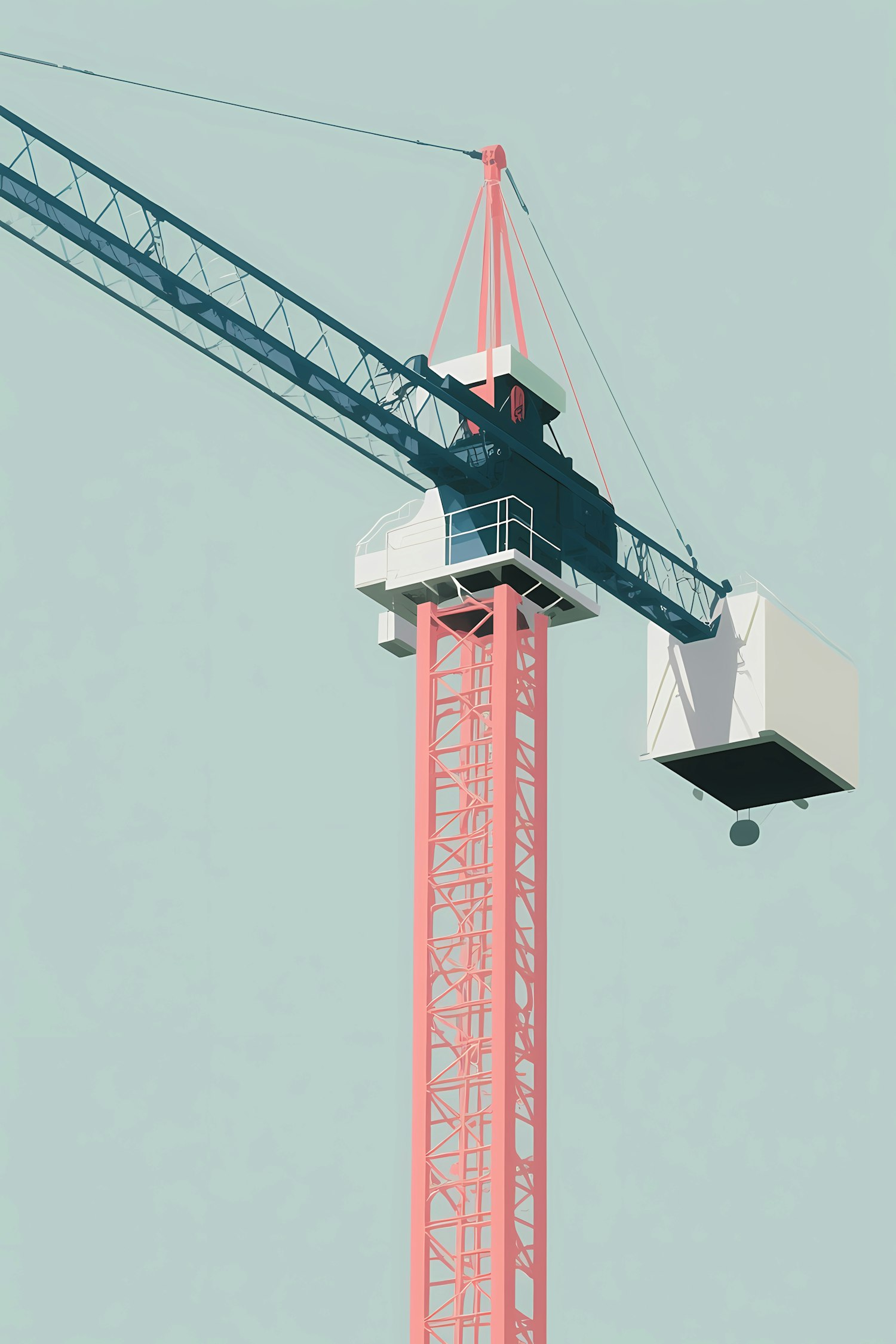 Stylized illustration of a construction crane with a pink tower and blue arm against a pale blue background, showcasing modern design.
