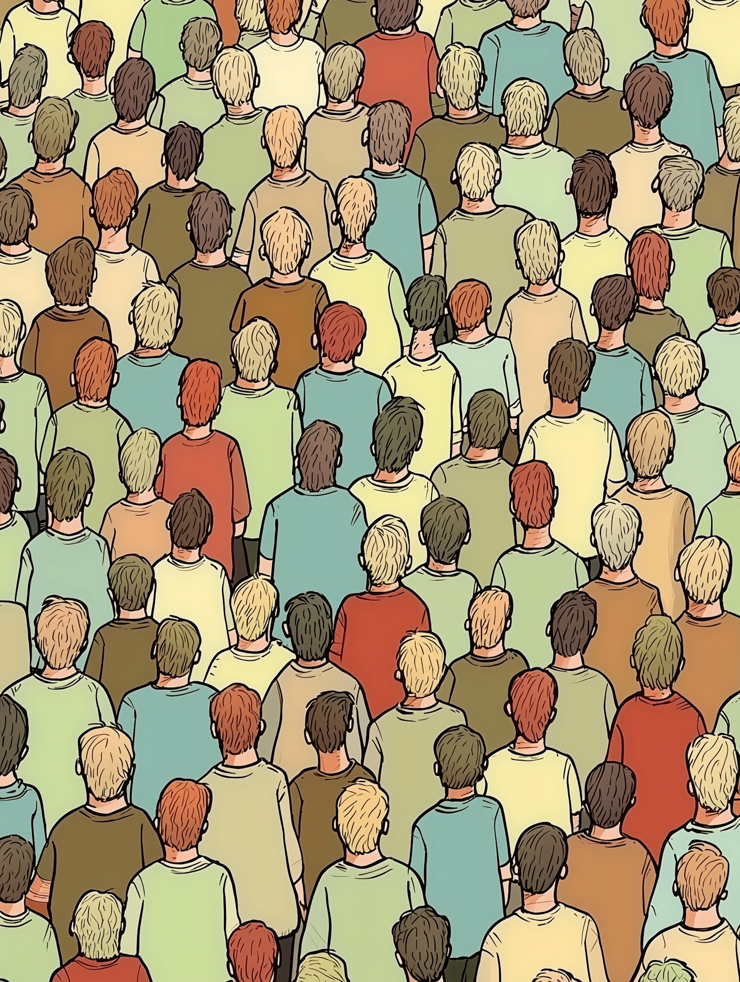 A colorful illustration of a large crowd viewed from behind, showcasing diverse hair colors and muted clothing tones in a cartoon style.