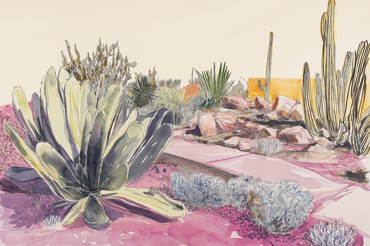 Vibrant desert landscape illustration with agave, cacti, and pink ground, showcasing bold colors and intricate details.