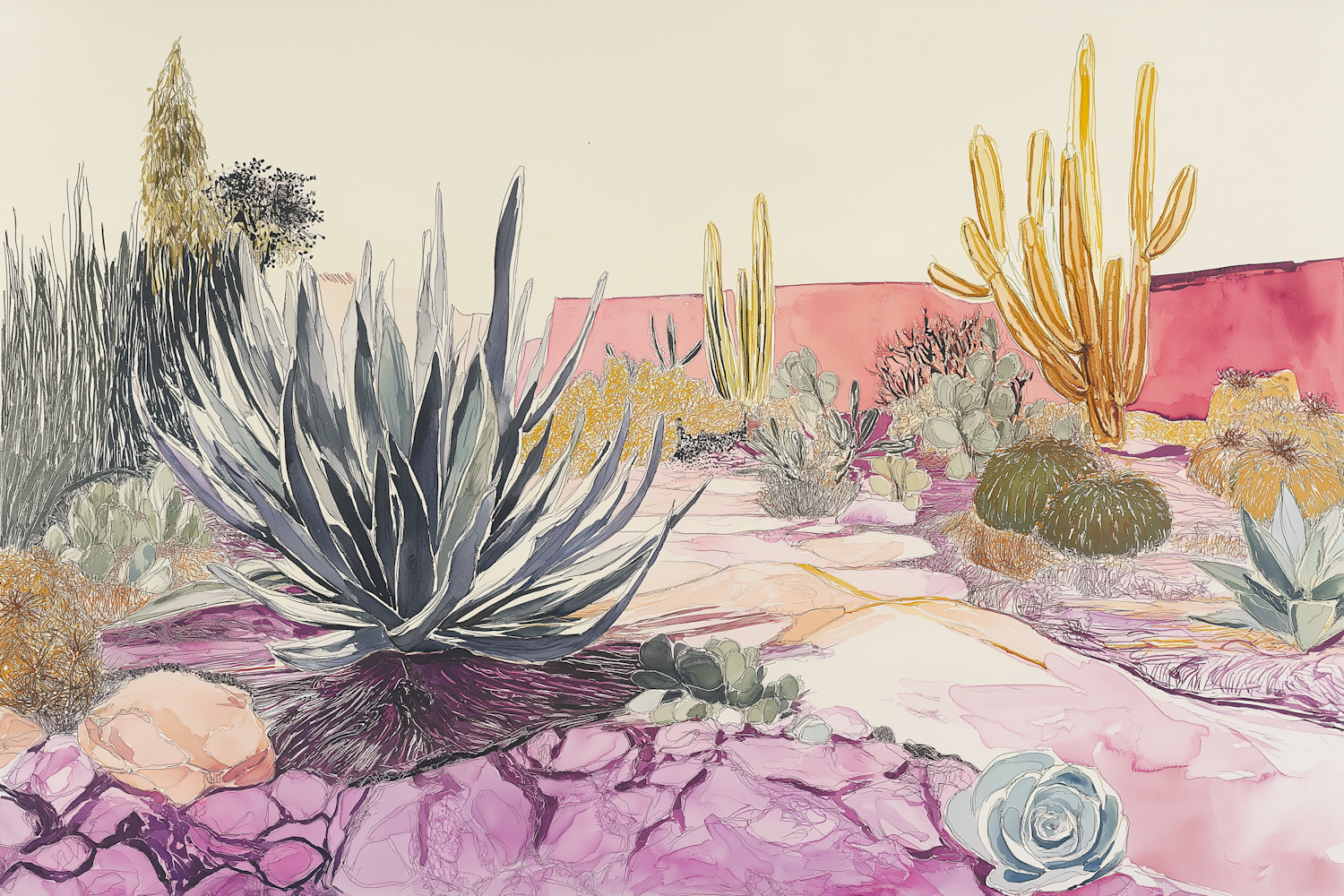 Colorful desert landscape illustration with agave, cacti, and succulents. Pink and purple tones create a vibrant, surreal scene.