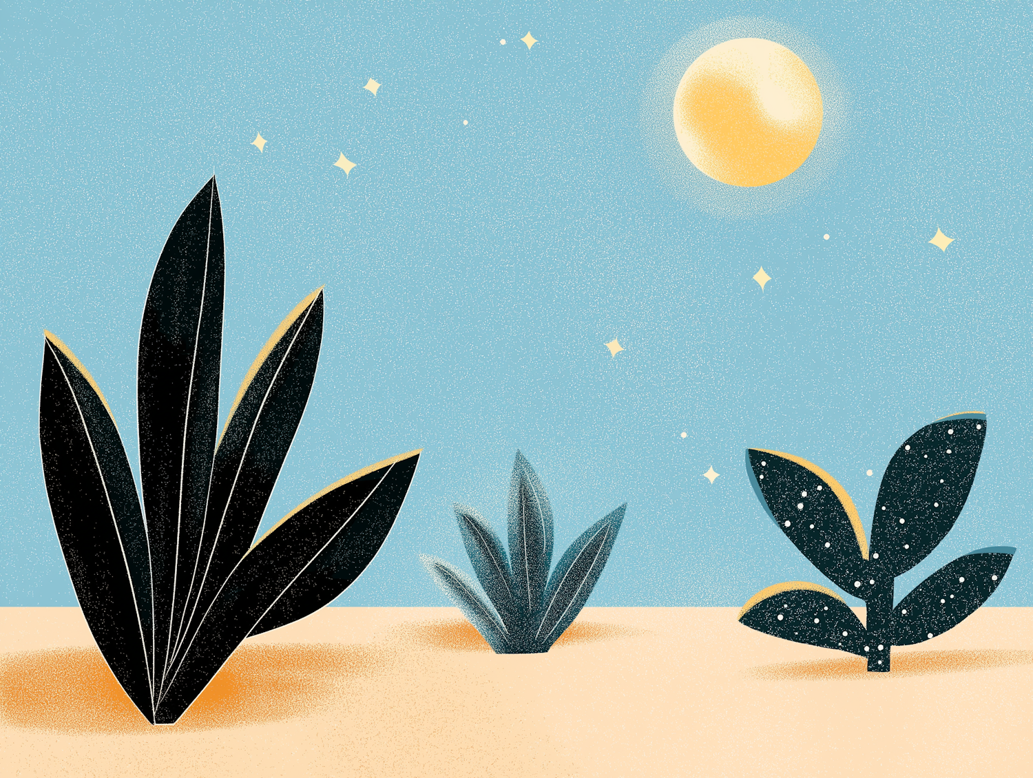Stylized desert scene with dark green plants, a glowing sun, and twinkling stars on a textured blue sky.