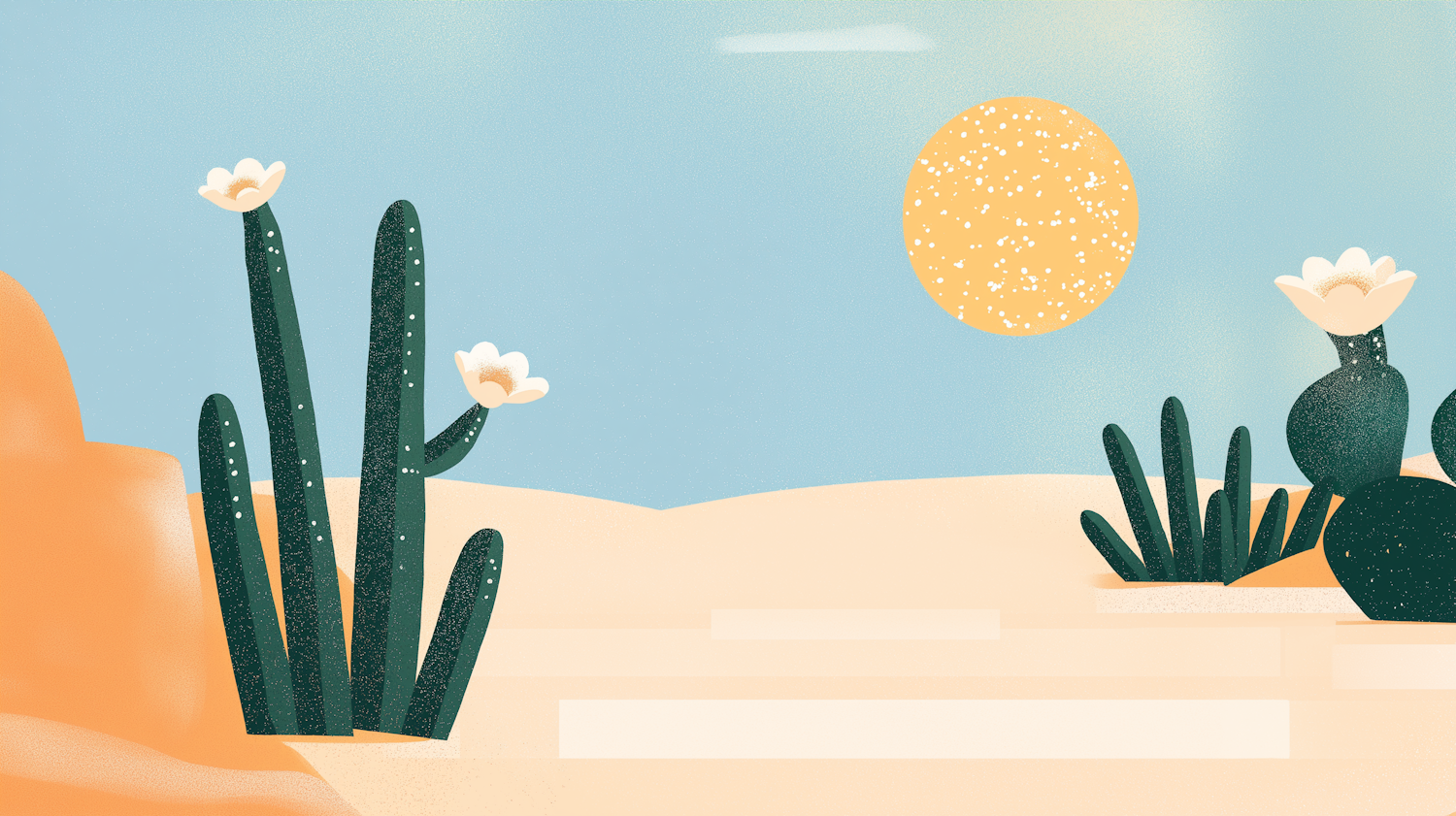 Stylized desert scene with blooming cacti, a textured sun, and soft sandy hues, creating a serene and inviting atmosphere.