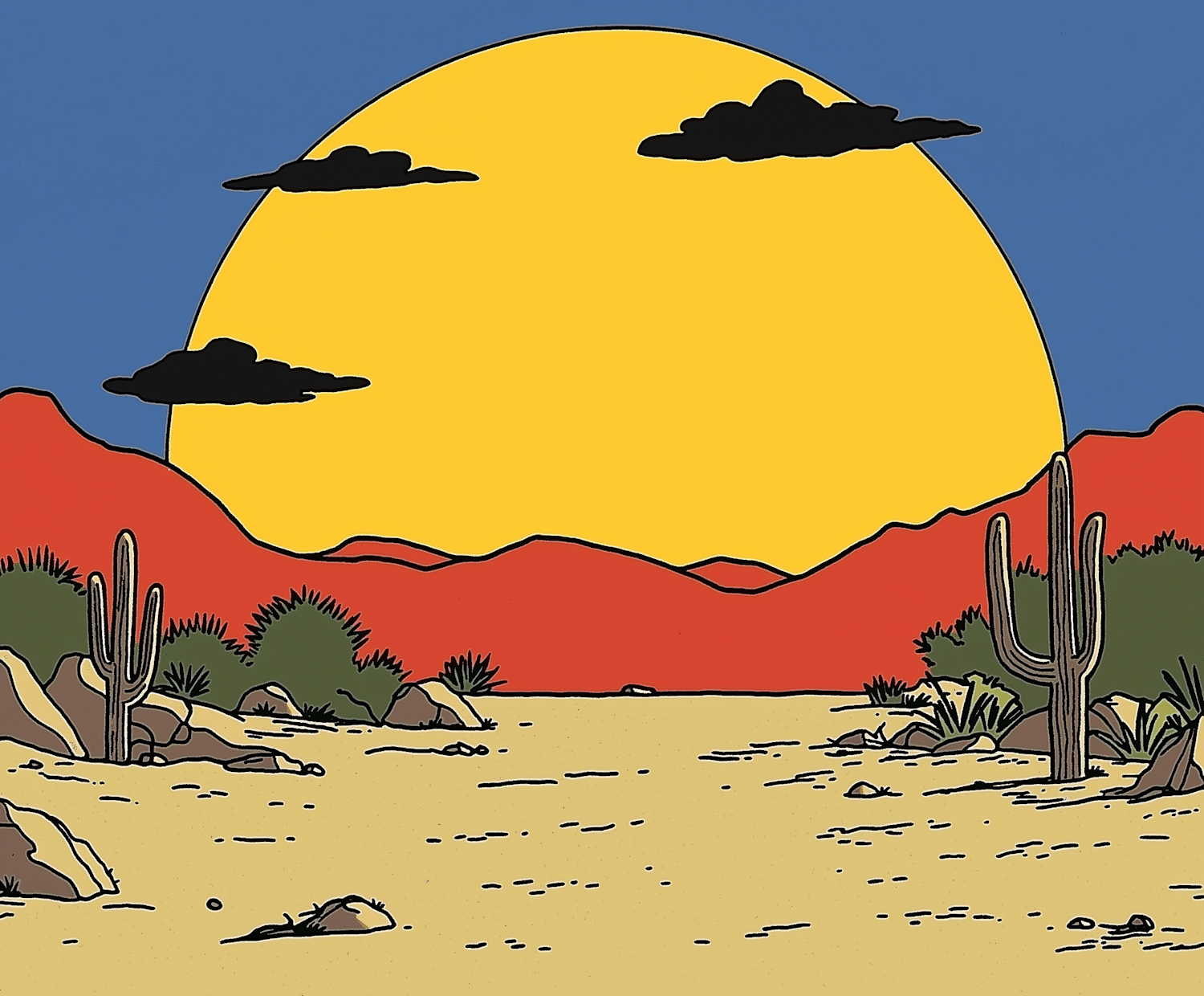 Vibrant desert illustration with a large yellow sun, red mountains, and cacti under a deep blue sky with black clouds.