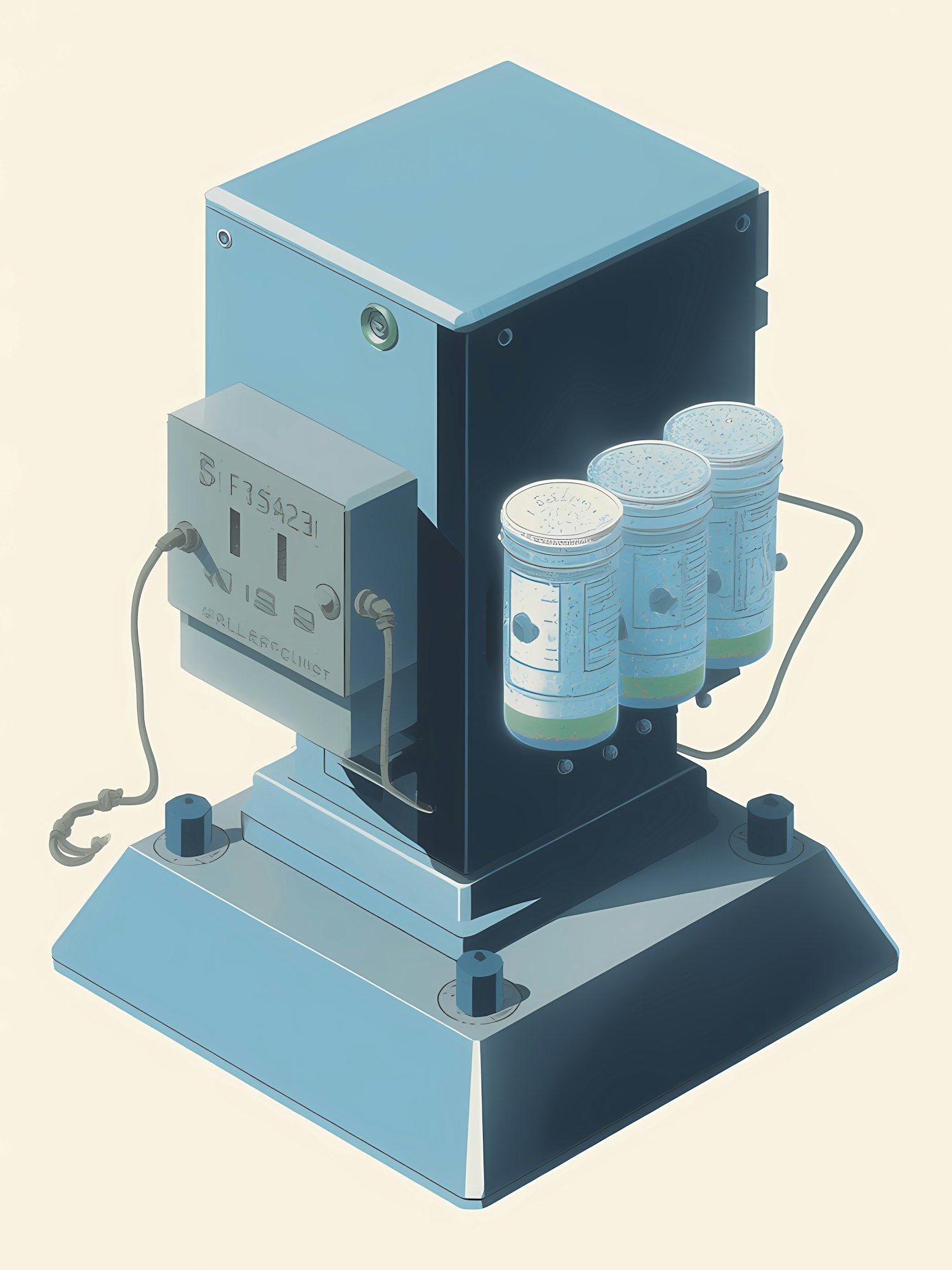 Stylized illustration of a mechanical device with cylindrical containers, cables, and a metallic finish, set against a light beige background.