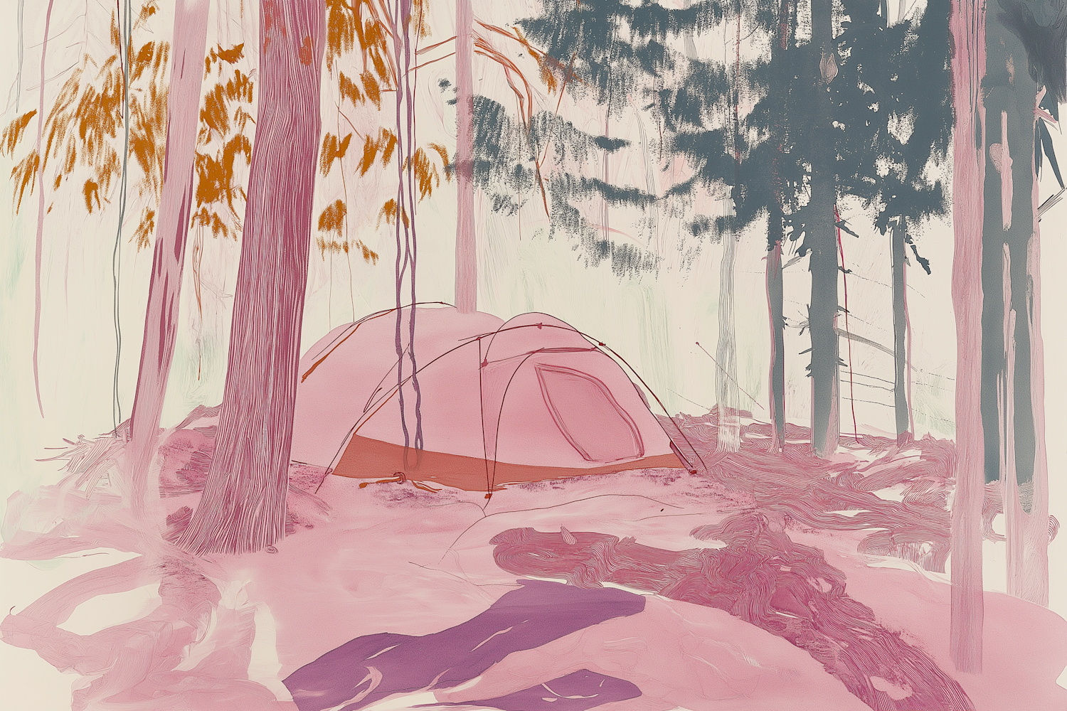A pastel-colored forest scene with a pink tent among tall trees, creating a dreamy and serene atmosphere.