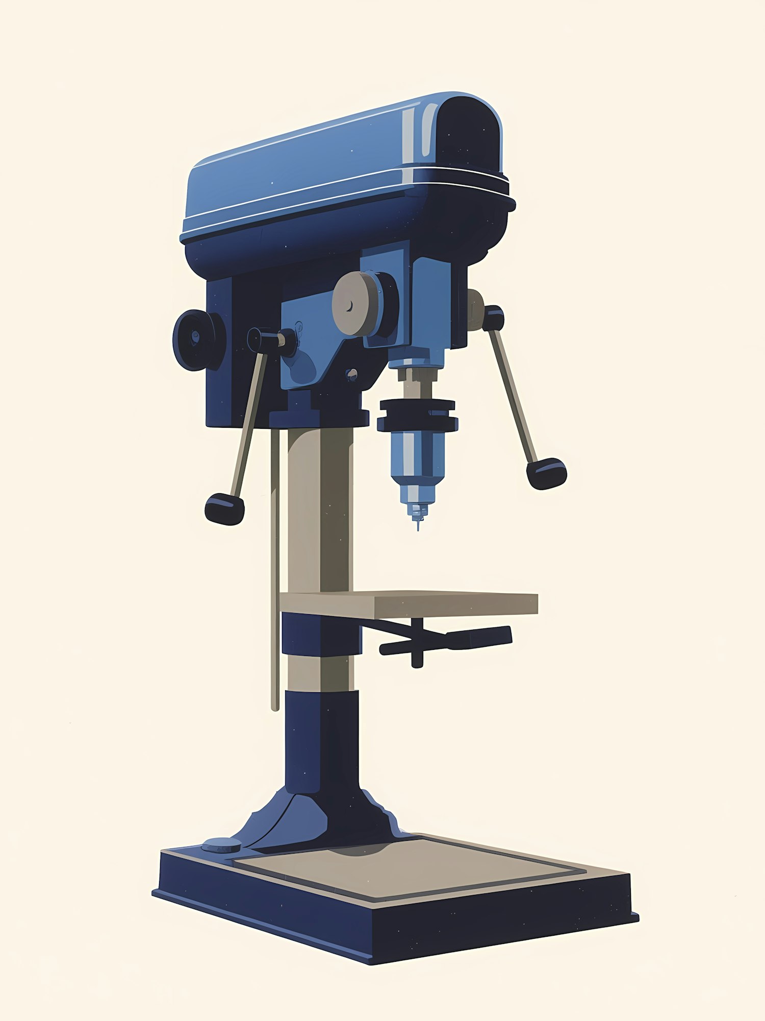 Stylized illustration of a blue drill press with a beige background, showcasing its mechanical design and clean lines.