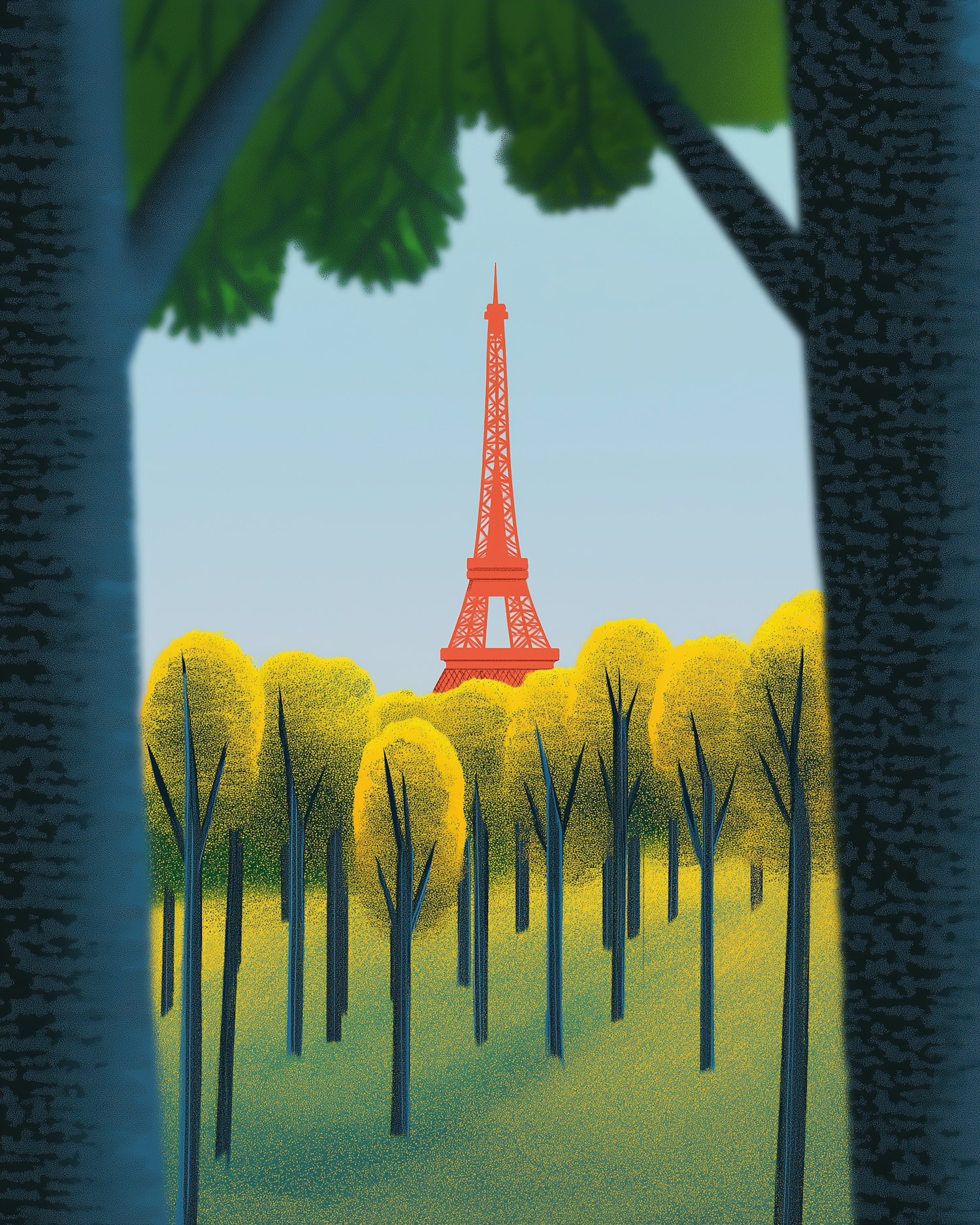 Illustration of the Eiffel Tower framed by a vibrant forest with yellow-green trees and a serene blue sky.