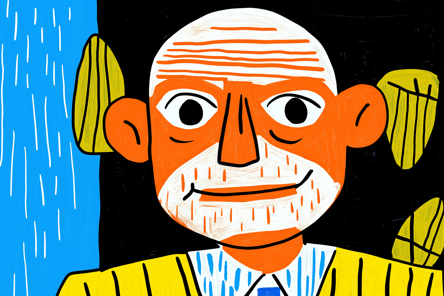 Bold illustration of a bald man with an orange face, white beard, and expressive eyes. Vibrant colors and abstract background elements.
