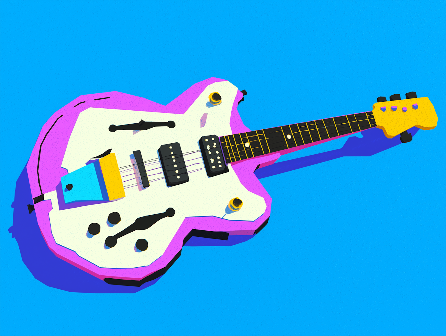 Stylized electric guitar illustration with bold pink, white, and yellow tones on a bright blue background. Retro and vibrant aesthetic.