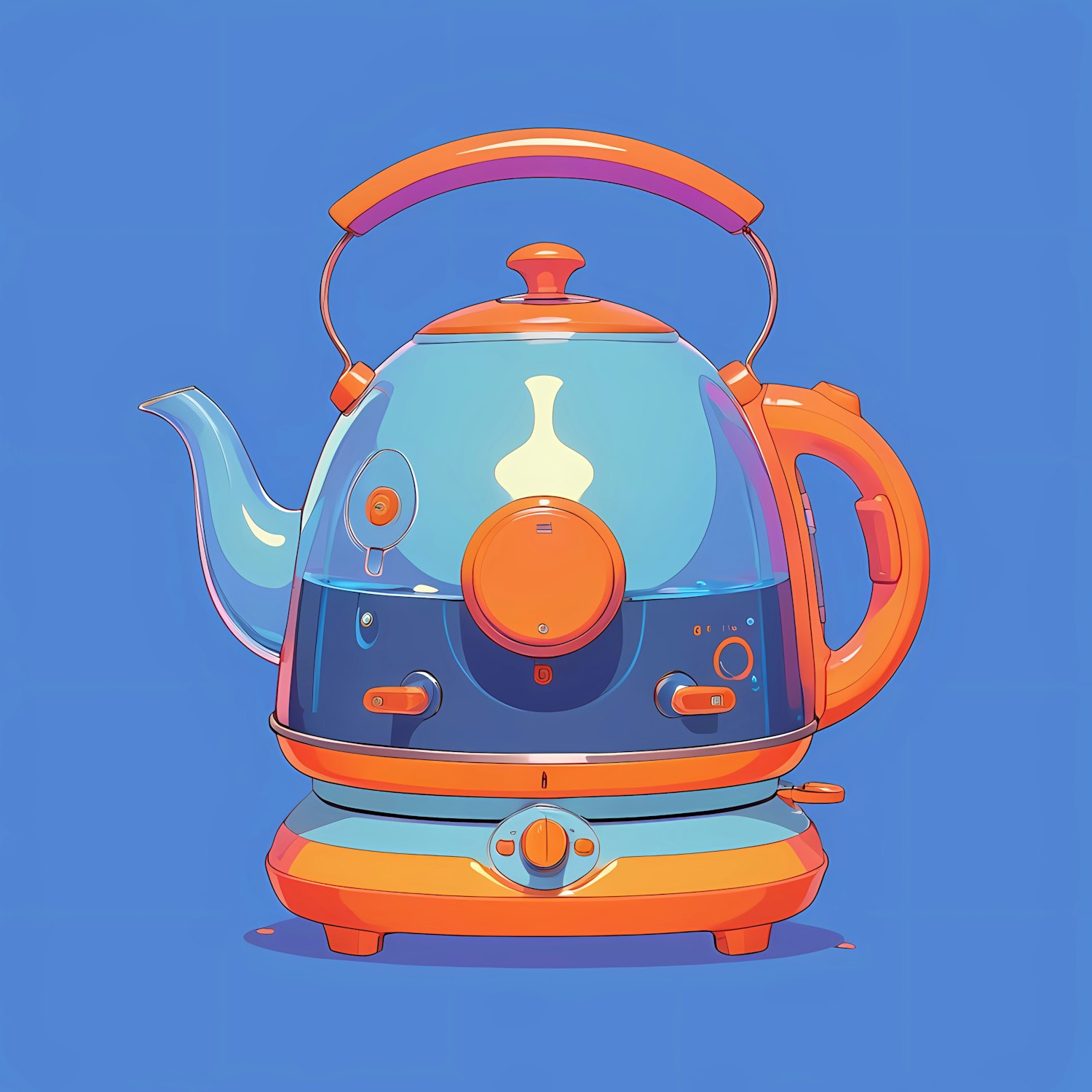 Colorful retro-style electric kettle illustration with blue and orange accents on a solid blue background.