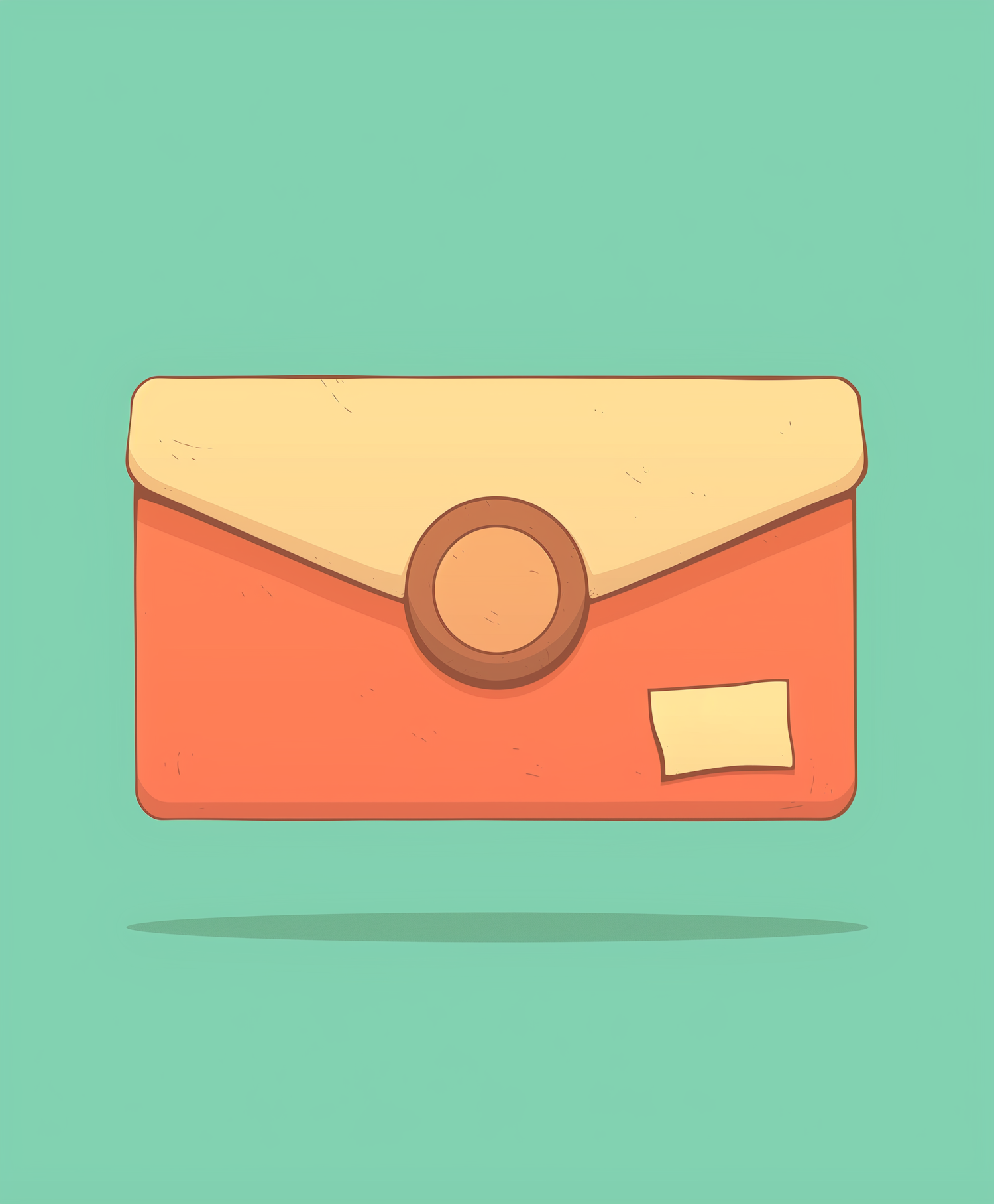 Cartoonish orange envelope with beige flap and seal on teal background, featuring a minimalistic design and soft shadows.