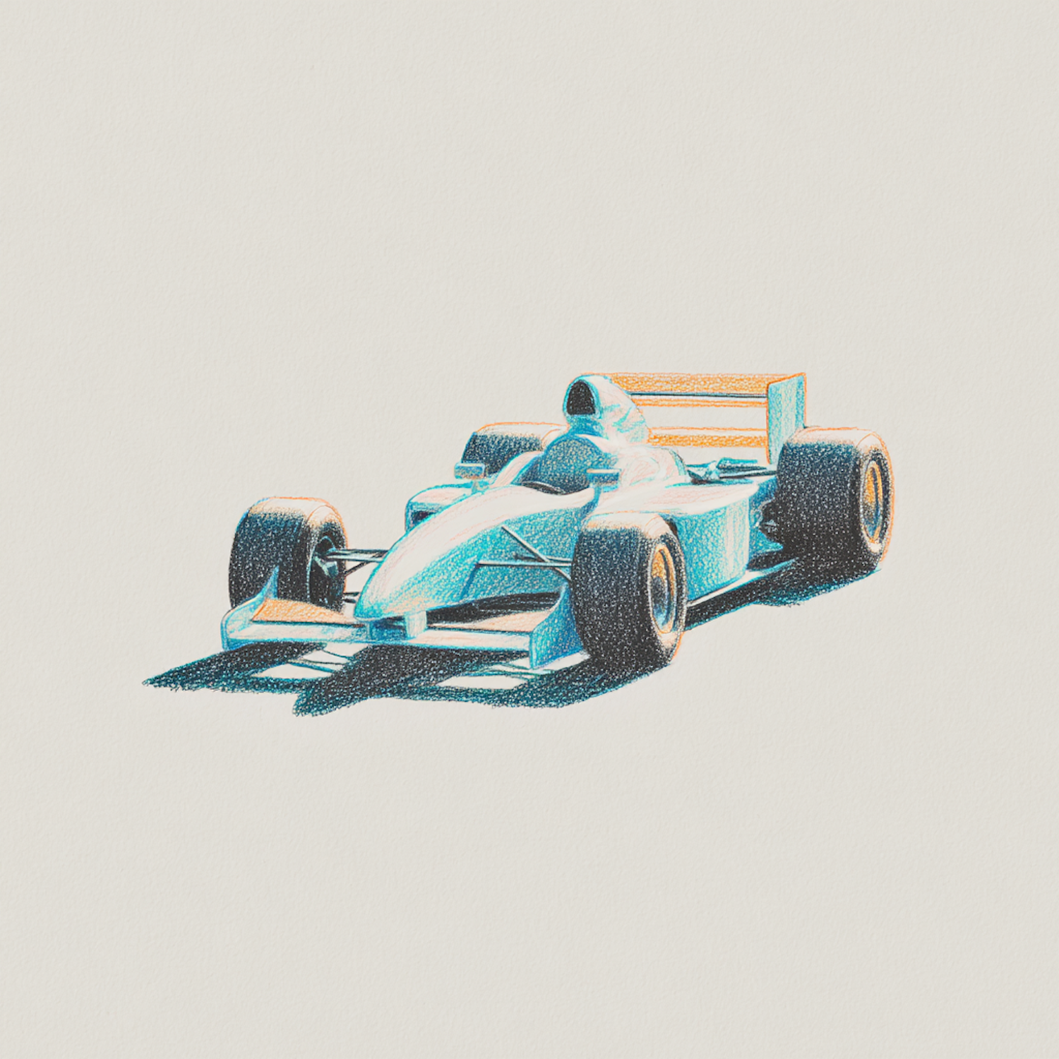 Stylized illustration of a Formula 1 car in blue and orange tones, showcasing its sleek design against a plain background.