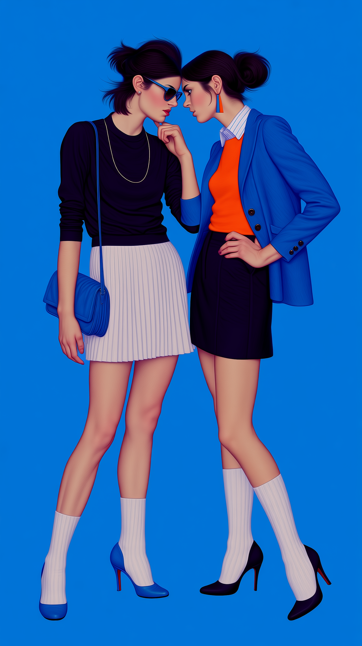 Stylized illustration of two fashionable women interacting, dressed in chic outfits with vibrant colors against a bold blue background.