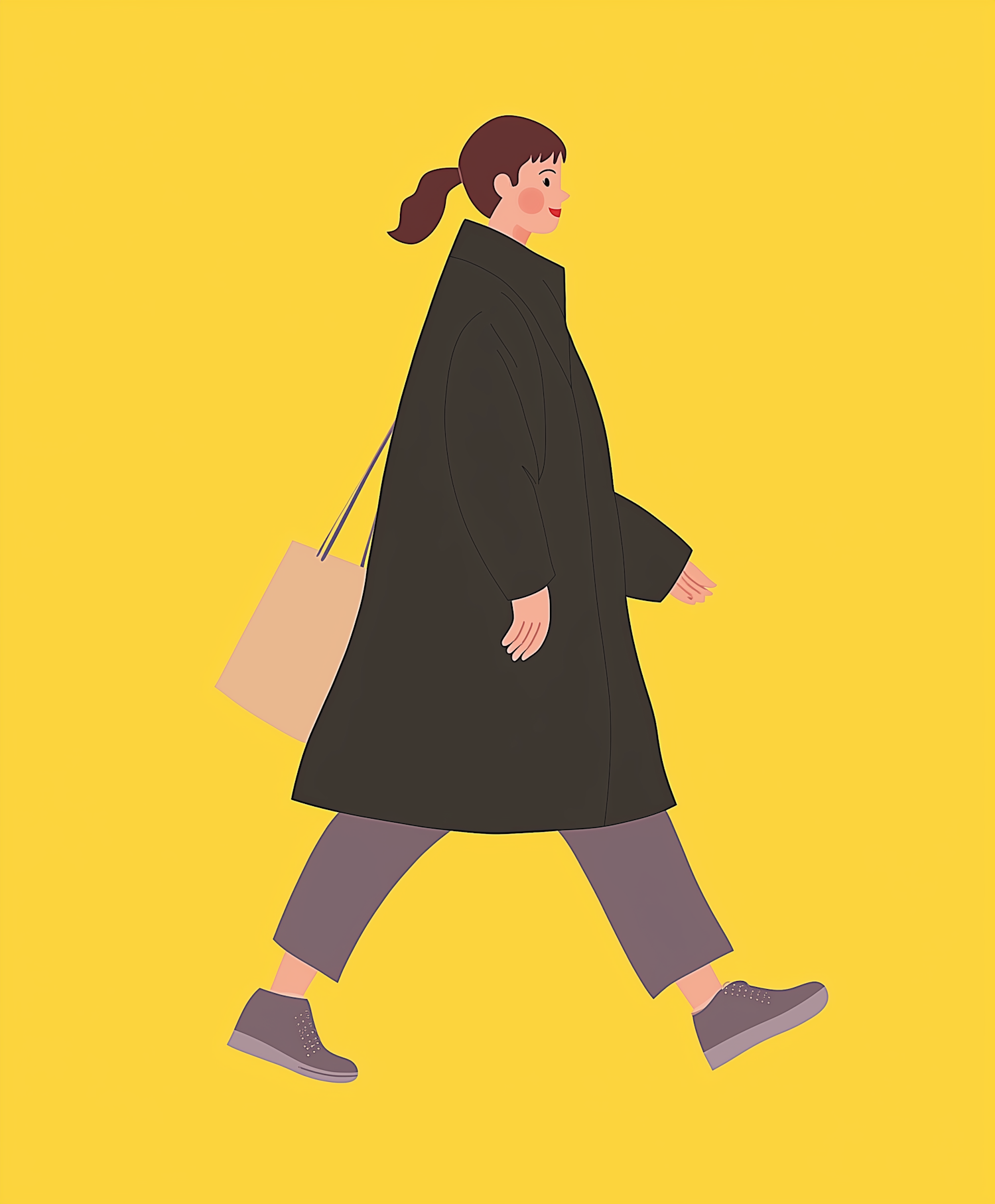 Minimalist cartoon of a person walking with a tote bag, wearing a dark coat and gray pants against a bright yellow background.
