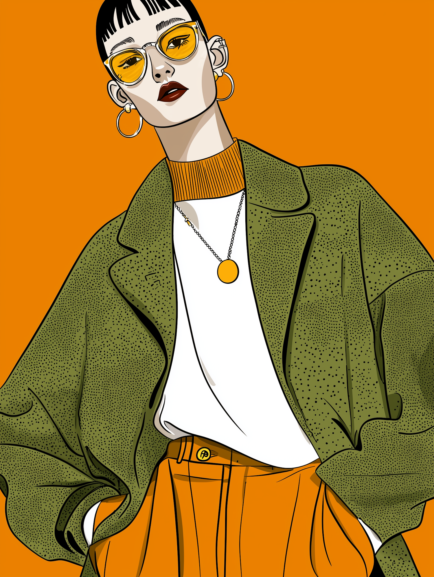 Stylish illustration of a person in bold orange and green attire, featuring yellow sunglasses and hoop earrings against an orange backdrop.