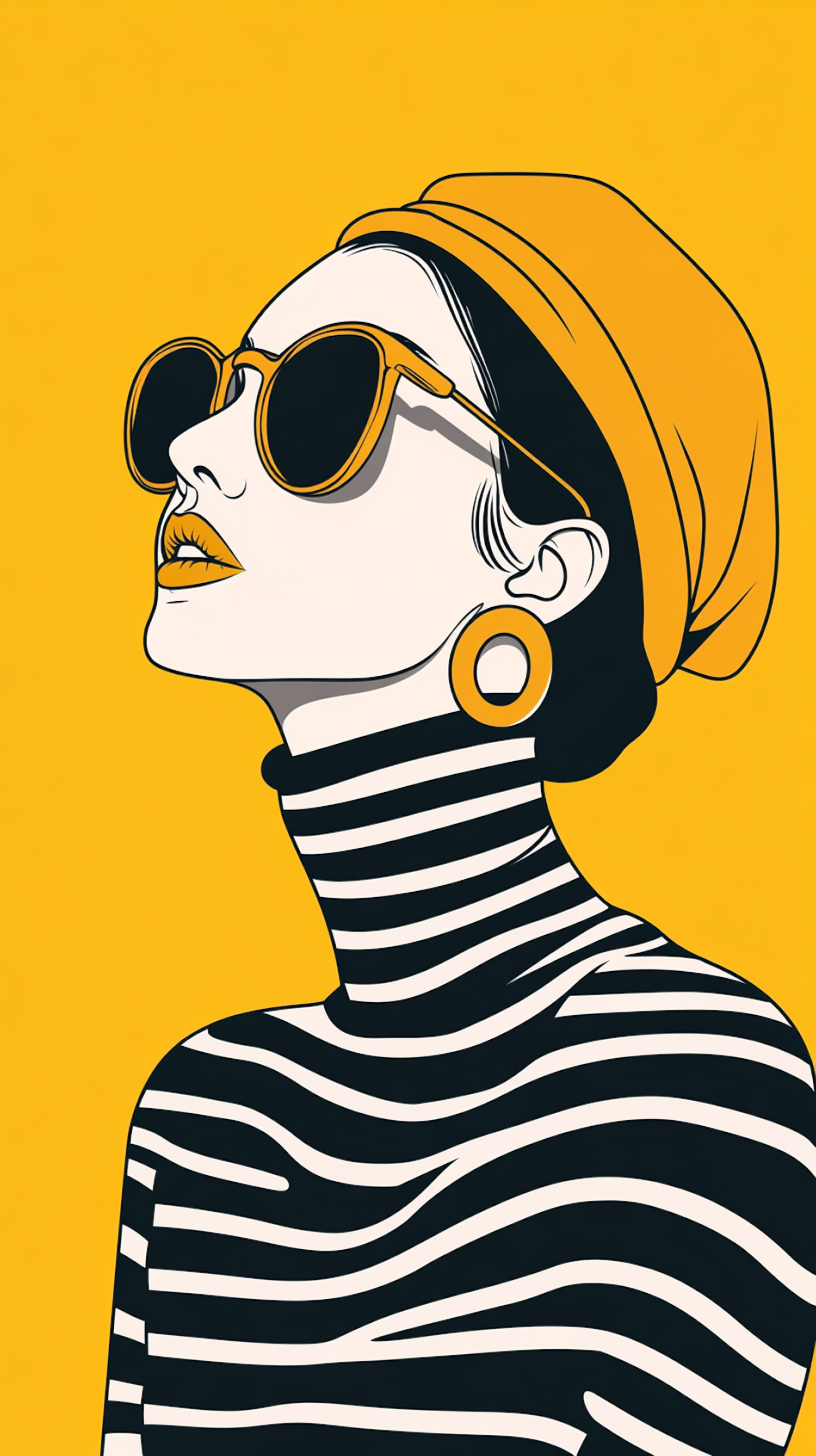 Stylized illustration of a woman in sunglasses and striped turtleneck against a vibrant yellow background.