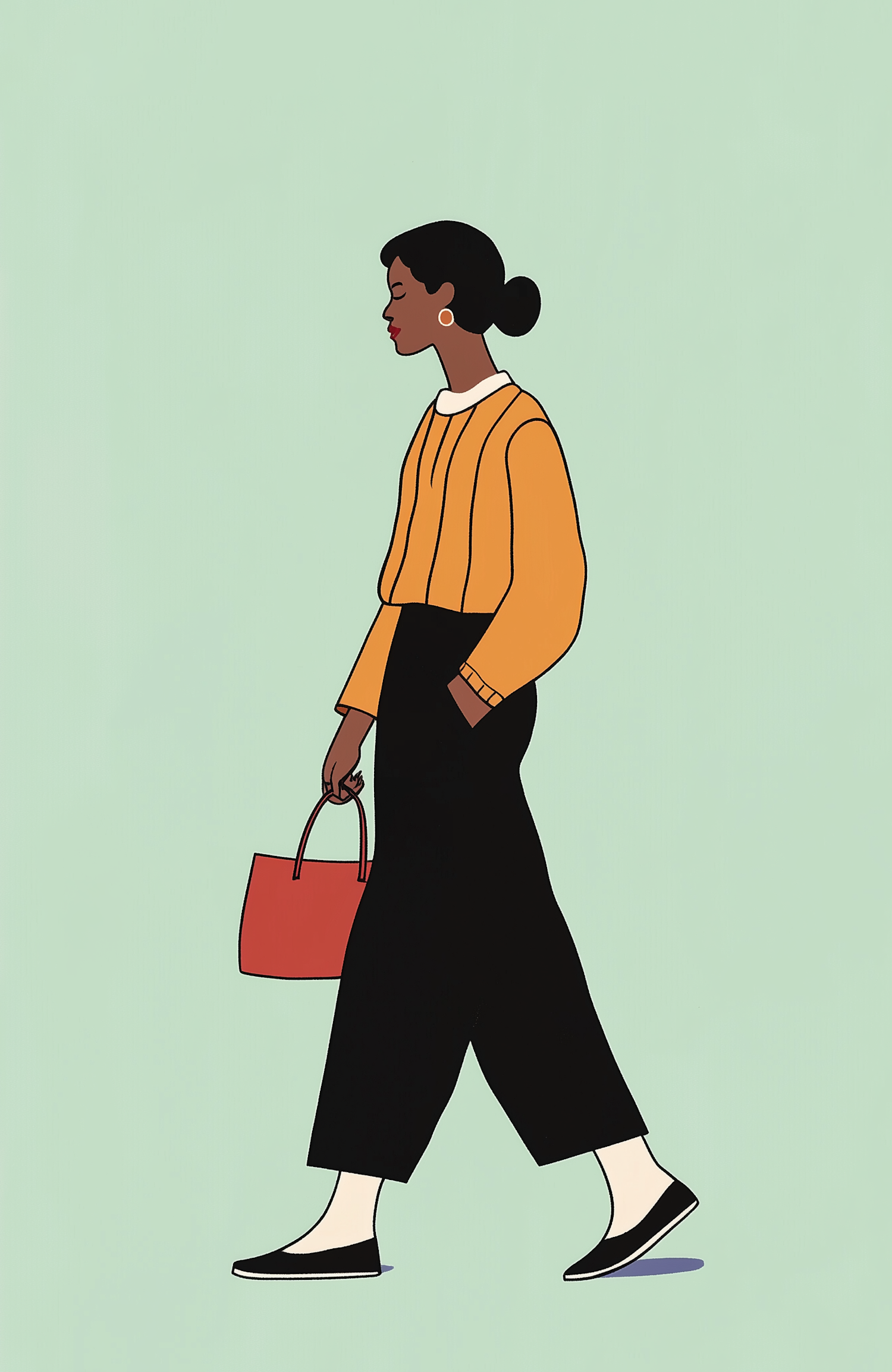 Stylish illustration of a Black woman in a mustard sweater and black pants, carrying a red handbag against a mint green background.