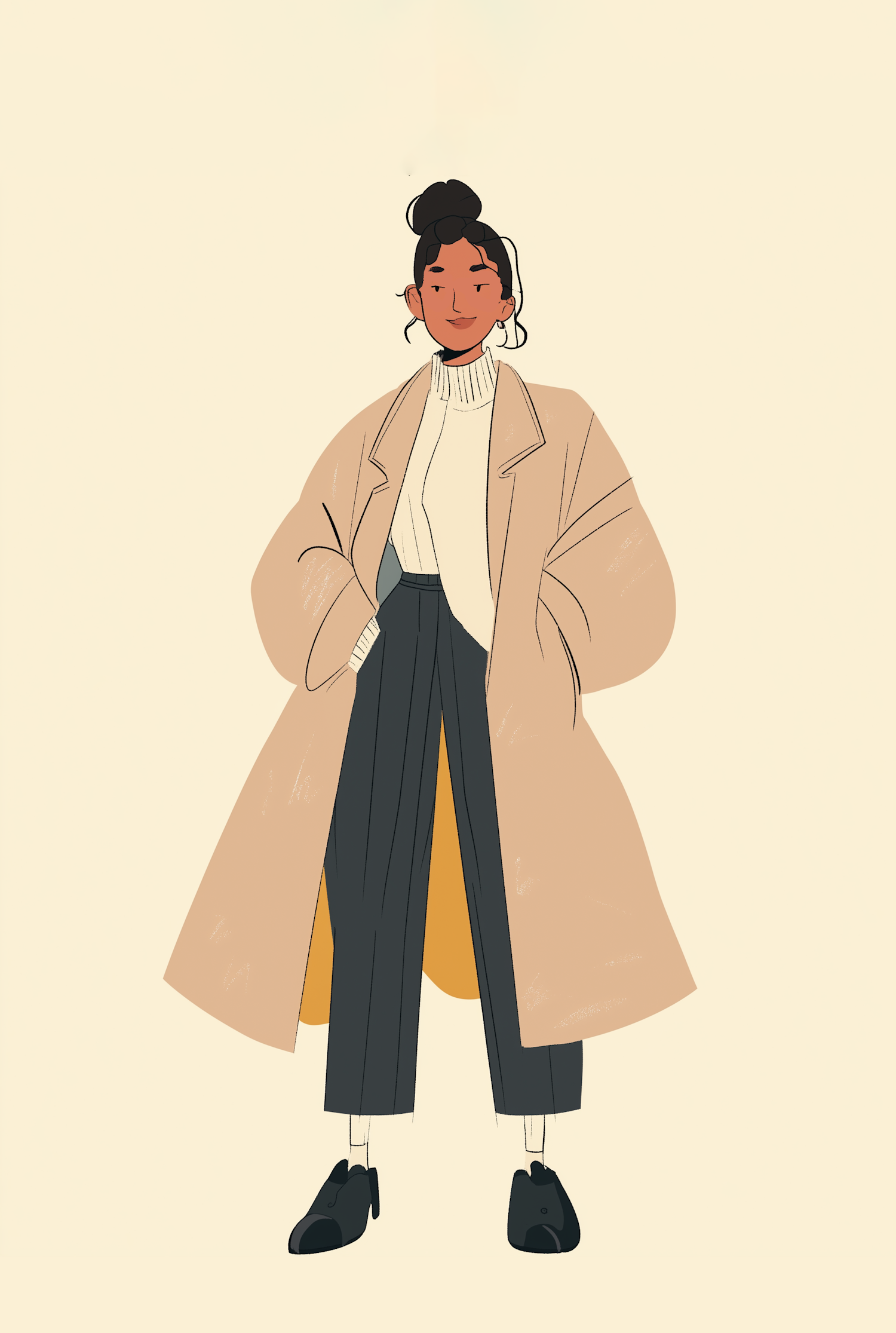 Illustration of a stylish person in a beige coat and dark trousers, exuding casual elegance against a light background.