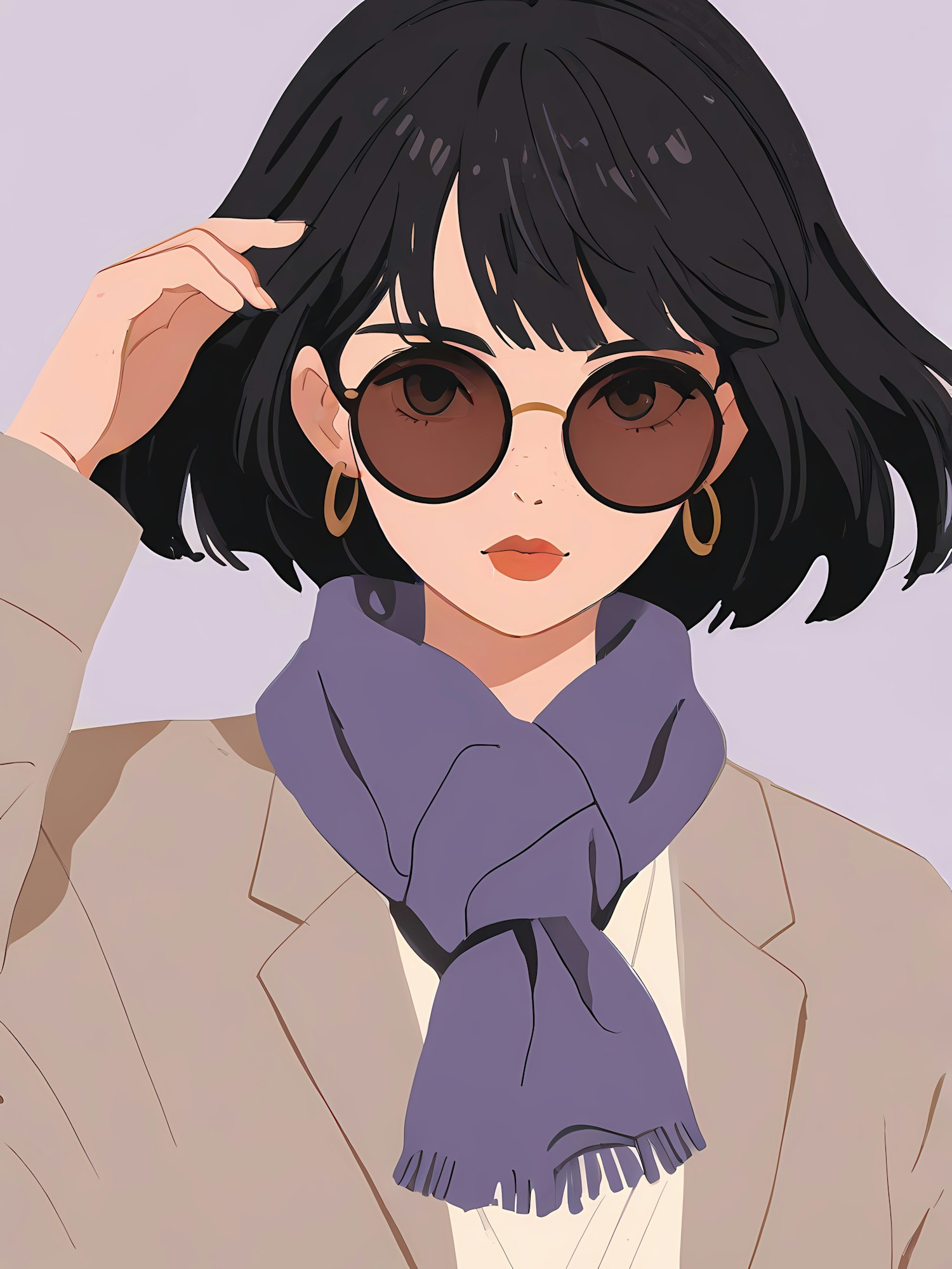 Stylish illustration of a woman with sunglasses, a beige blazer, and a purple scarf, exuding elegance and modern fashion.