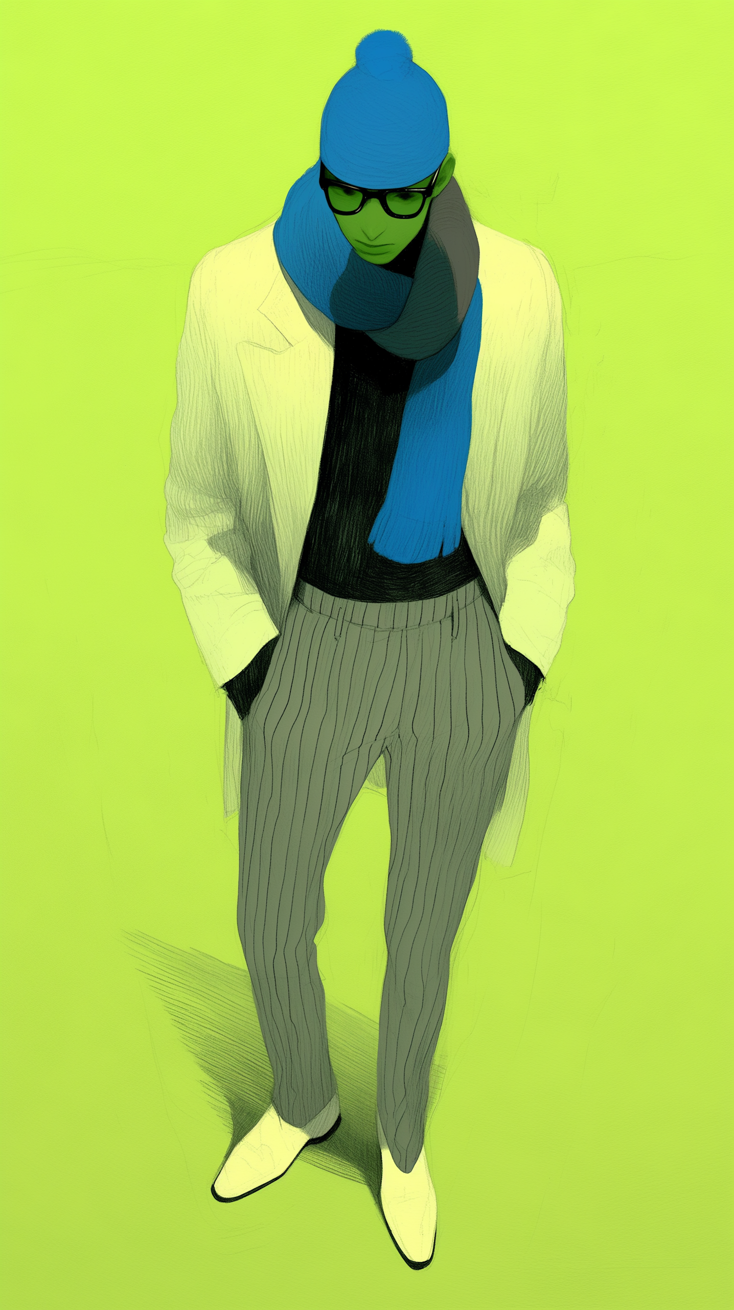 Stylized illustration of a person in a white coat, striped trousers, and blue accessories against a green background.