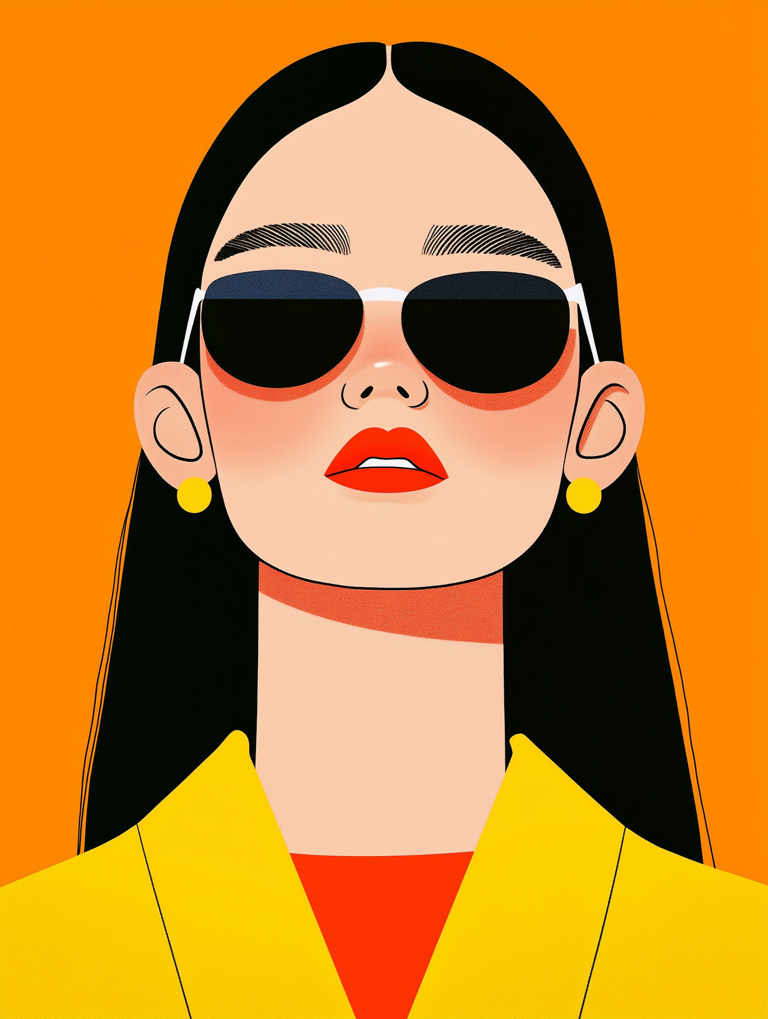 Stylized illustration of a woman with sunglasses, red lips, and yellow jacket on an orange background. Bold and modern design.