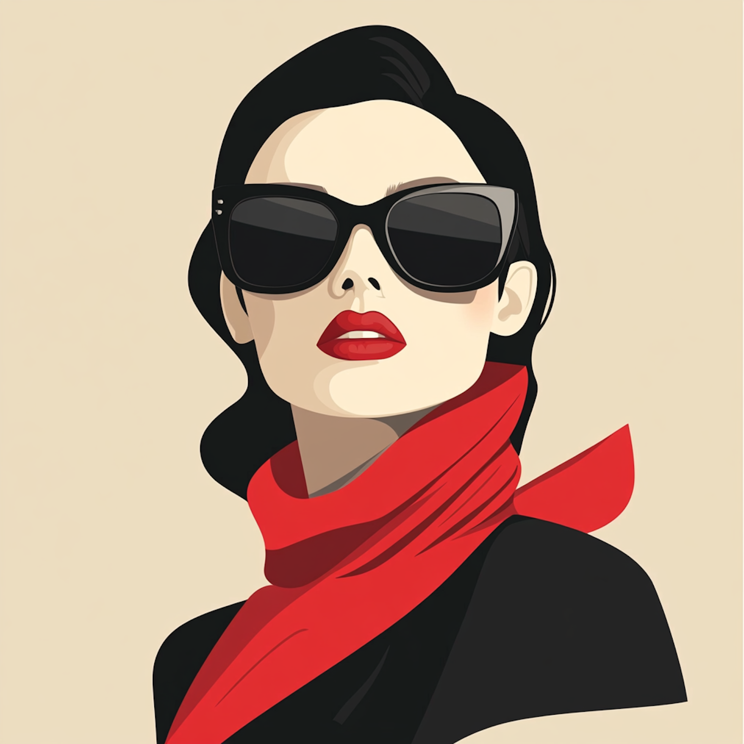 Stylish illustration of a woman with sunglasses, red lipstick, and a red scarf, exuding confidence and glamour against a beige background.