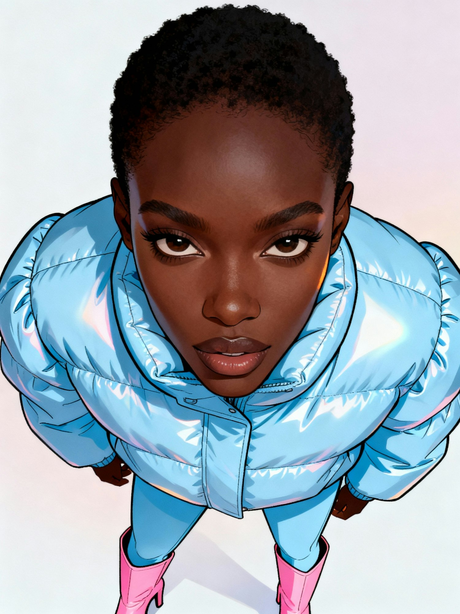 Stylized illustration of a person in a shiny blue puffer jacket and pink boots, viewed from above, with a confident and direct gaze.