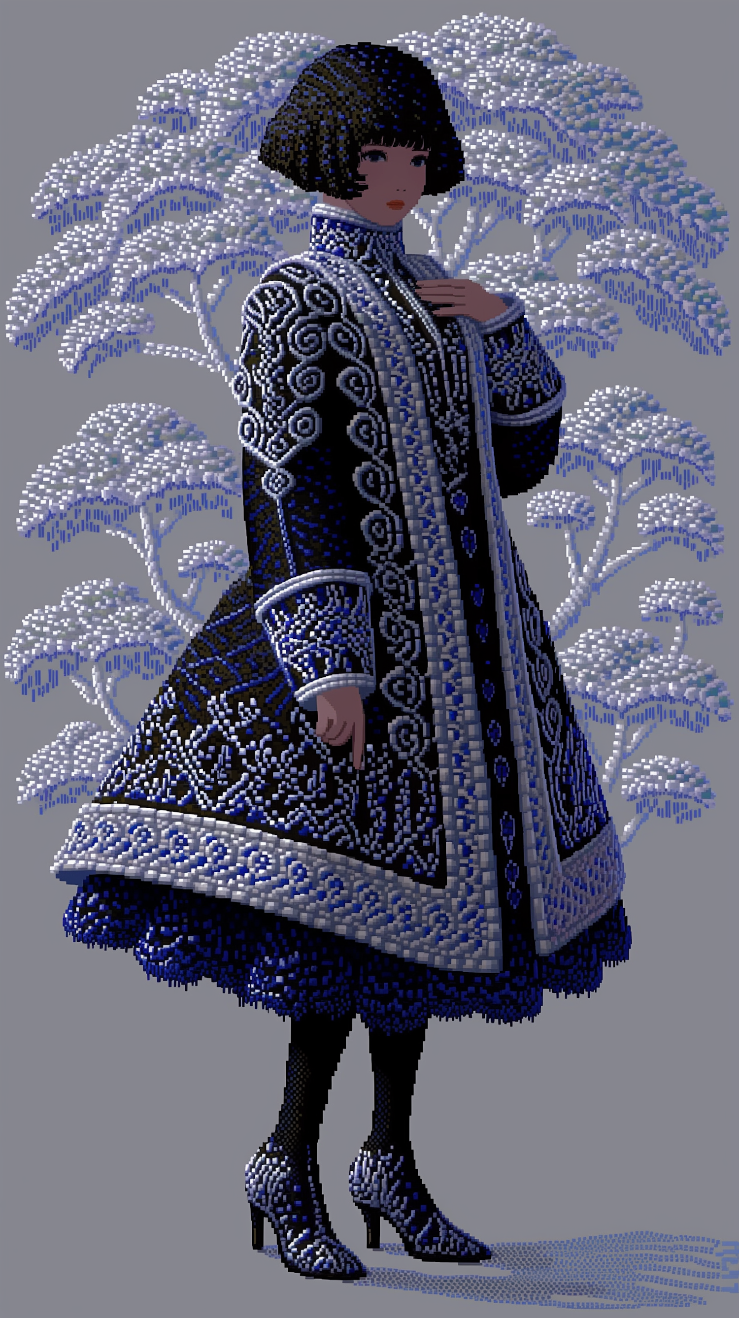 Stylized illustration of a person in a detailed blue and white coat with matching shoes, set against a pixelated abstract tree background.