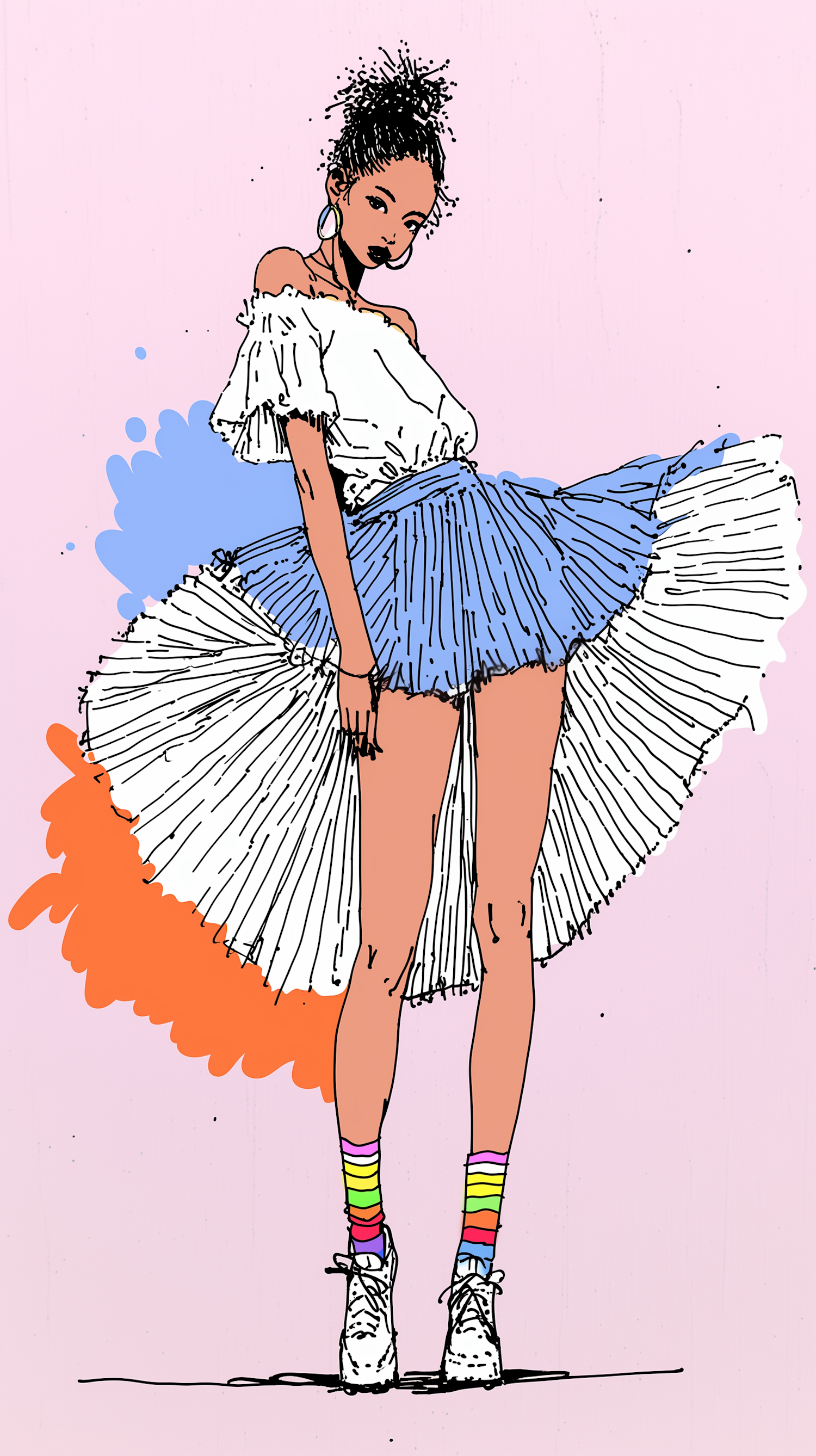 Stylized illustration of a person in a white top, blue skirt, and colorful socks, set against a pastel background with abstract splashes.