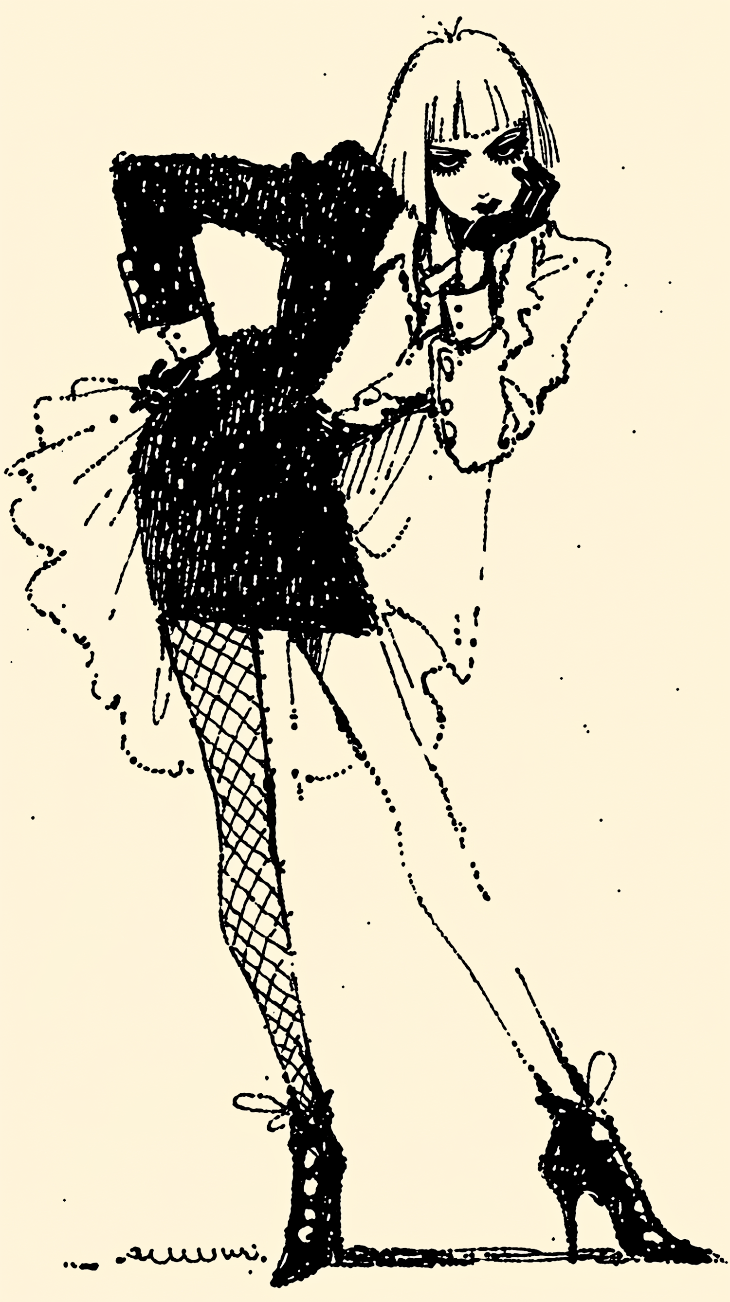 Stylized monochrome illustration of a person in a fashionable outfit, striking a confident pose with bold lines and minimalistic details.
