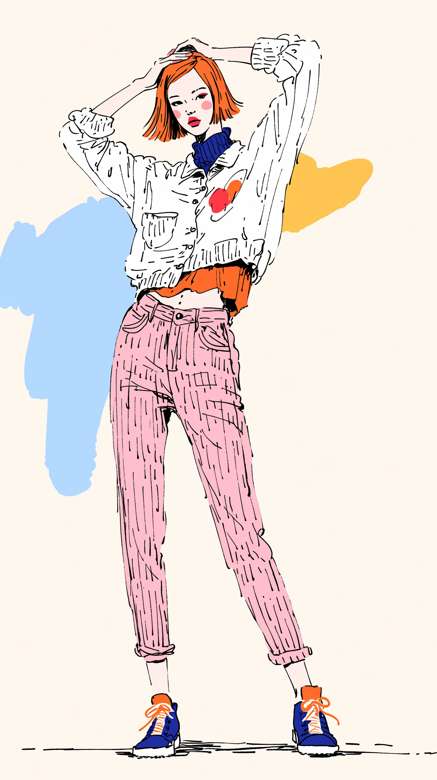 Stylized illustration of a fashionable individual in vibrant attire, set against a playful abstract background.