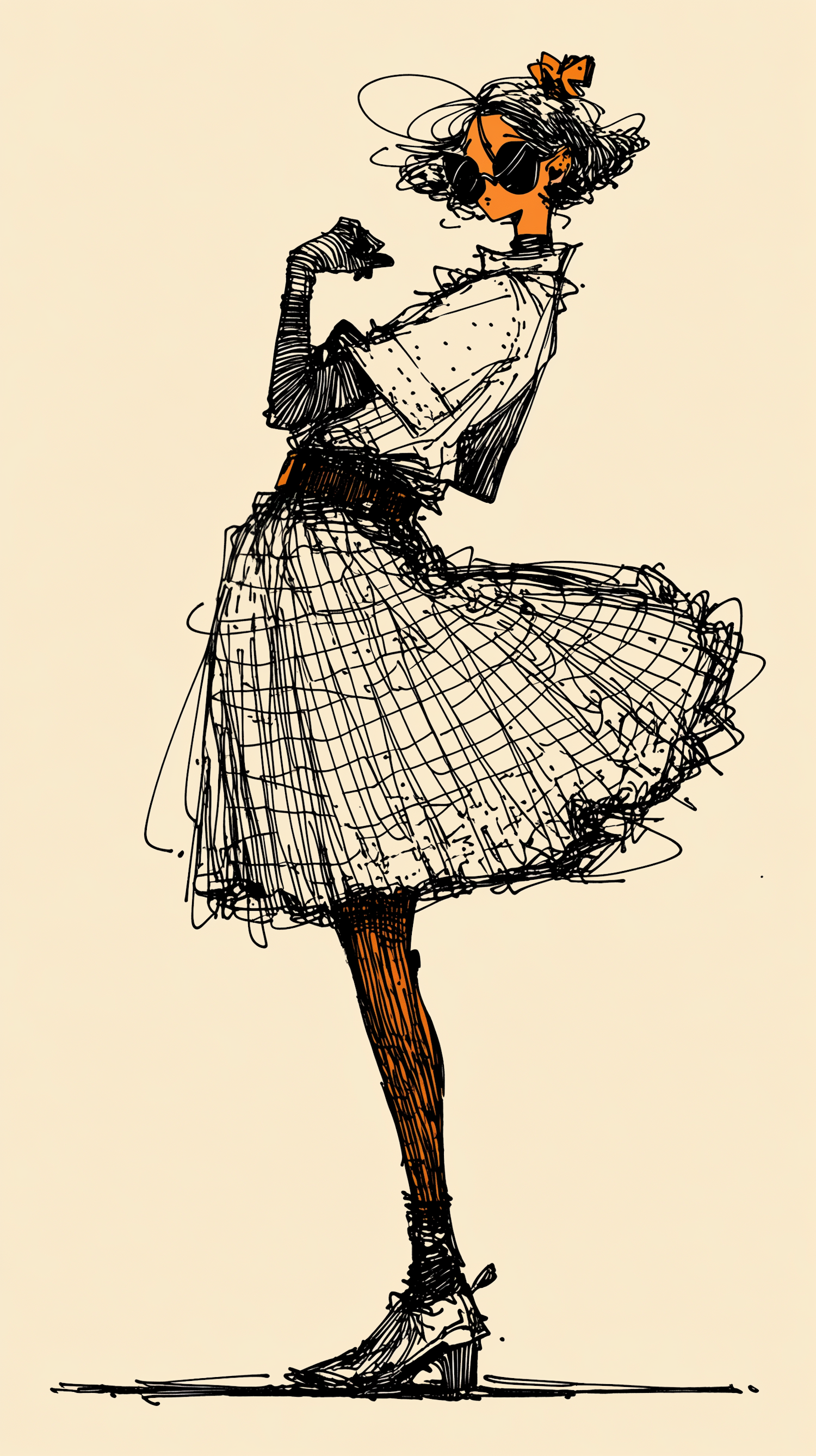 Stylized sketch of a fashionable figure in a flared skirt and sunglasses, showcasing dynamic lines and a minimalist background.