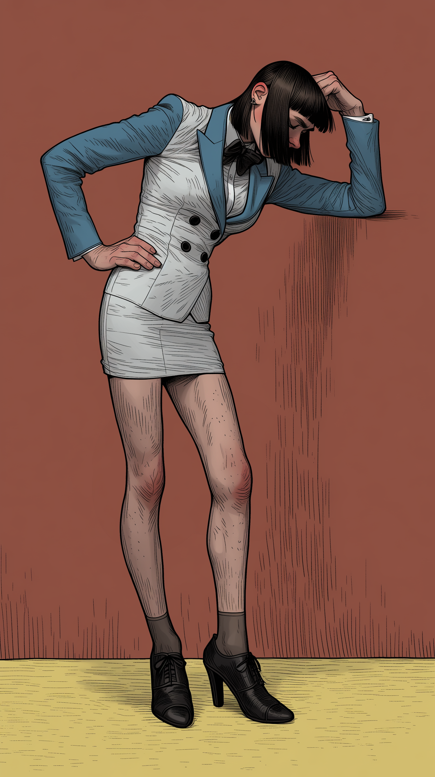 Stylized illustration of a person in a tailored outfit leaning against a wall, showcasing a unique and fashionable look.