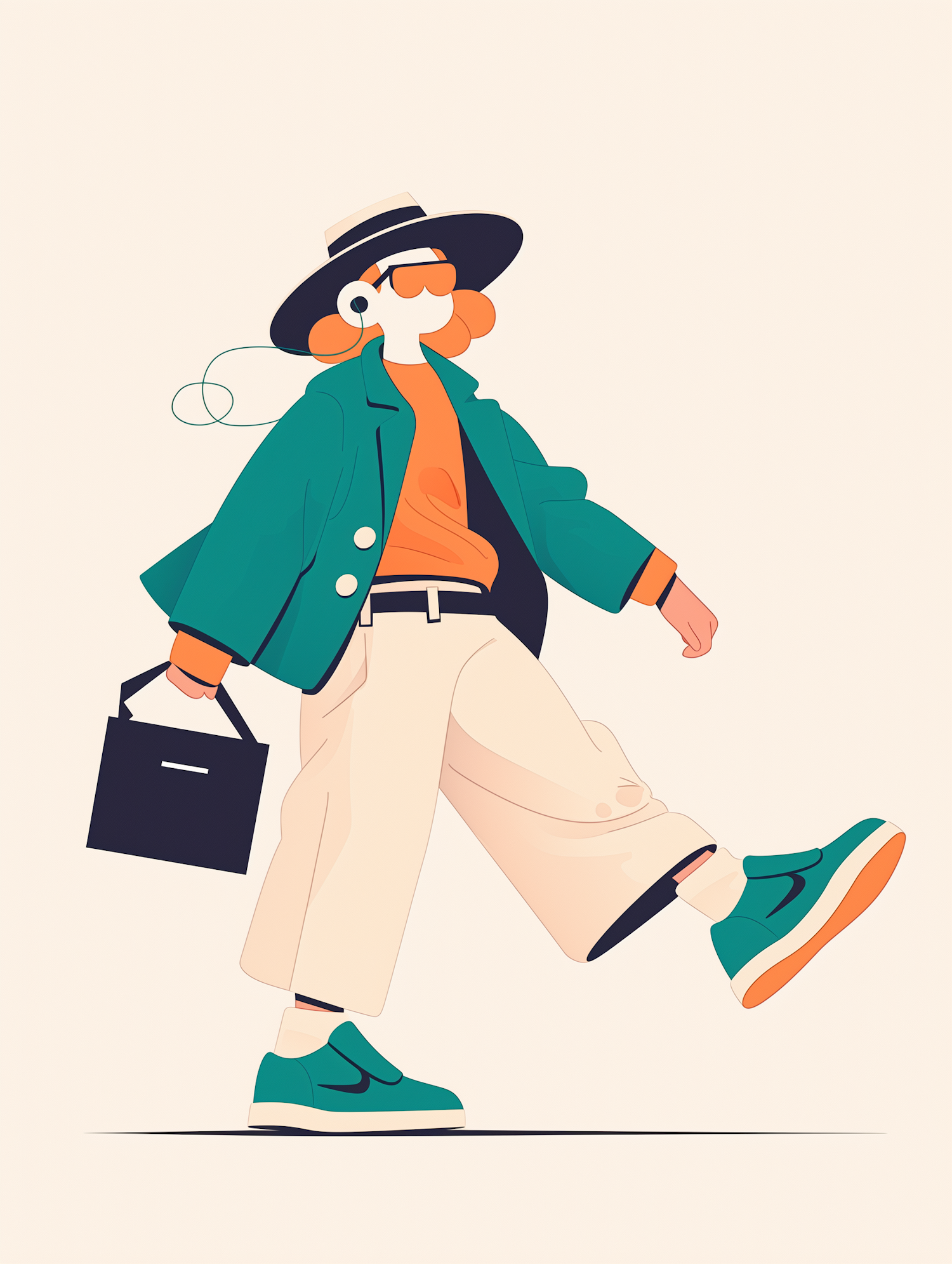 Stylized illustration of a fashionable person walking with a hat, sunglasses, and teal outfit, carrying a handbag.