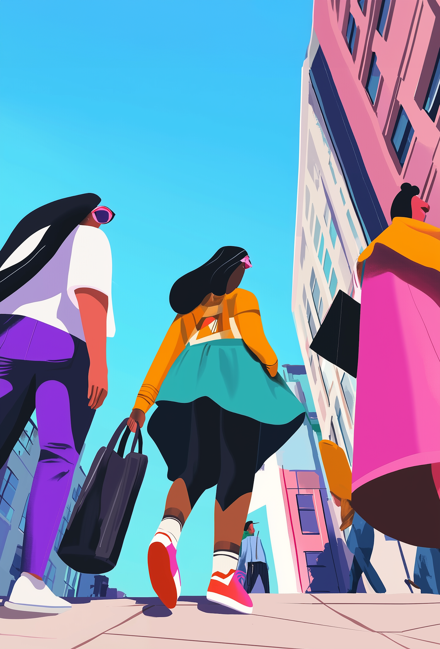 Colorful urban illustration of people walking with shopping bags, set against a bright blue sky and city buildings.