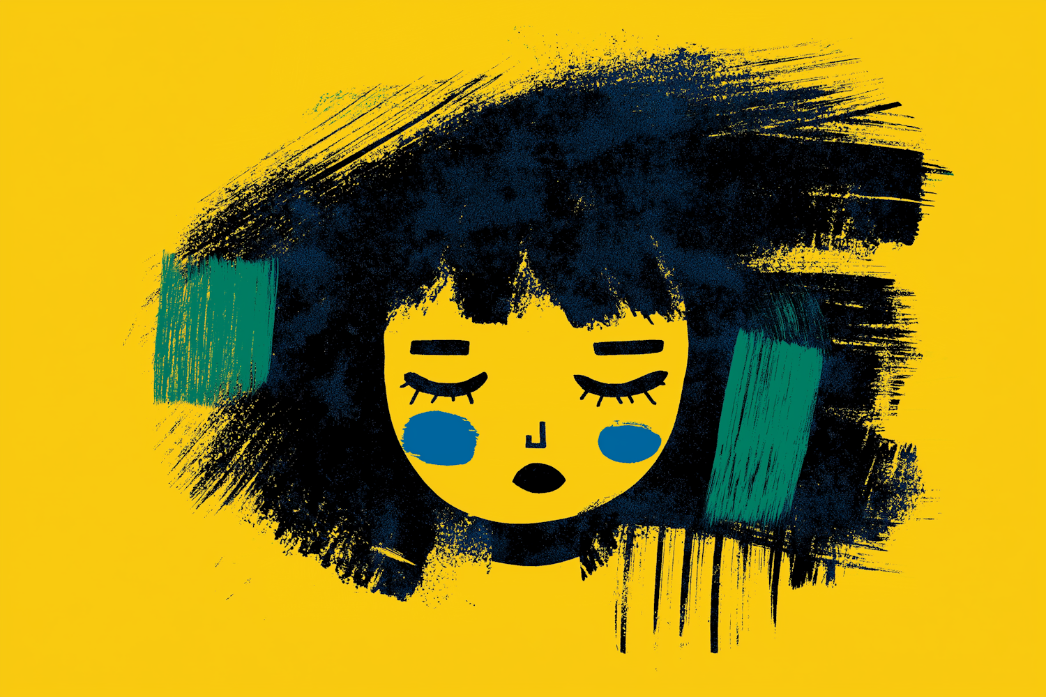 Abstract illustration of a serene face with closed eyes on a yellow background, featuring bold brush strokes and playful blue cheeks.