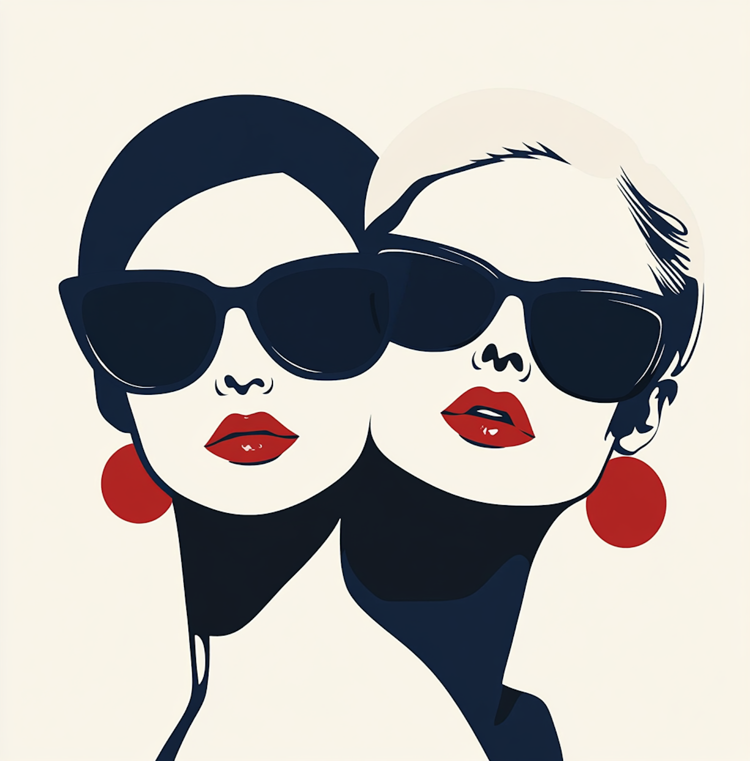 Stylized pop-art illustration of two women with sunglasses, red lips, and earrings, in bold black, white, and red colors.