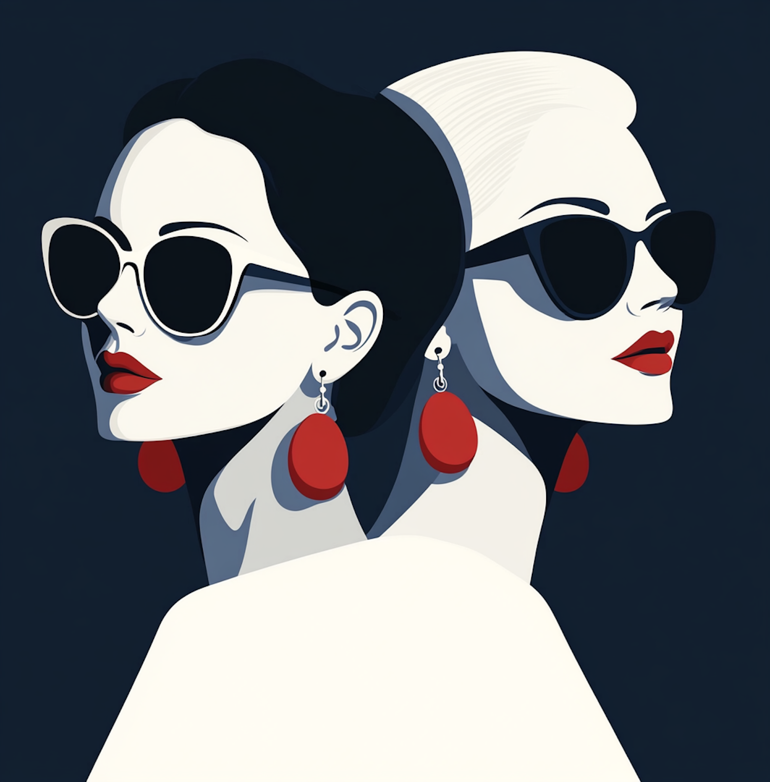 Stylized pop-art illustration of two women with sunglasses and red accents, set against a navy background.