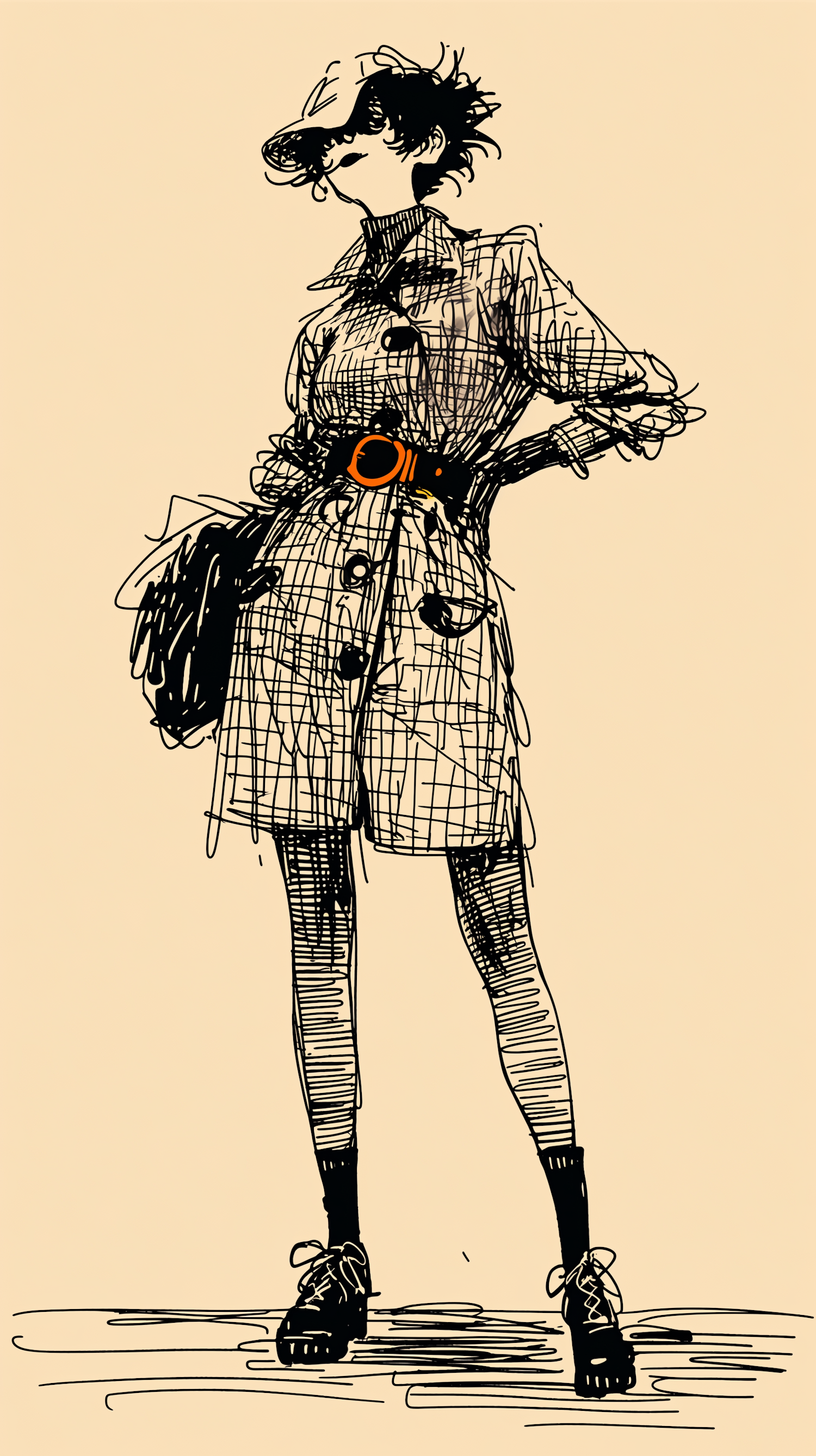 Stylized sketch of a person in a trench coat with a bold pose, featuring expressive lines and a minimal beige background.
