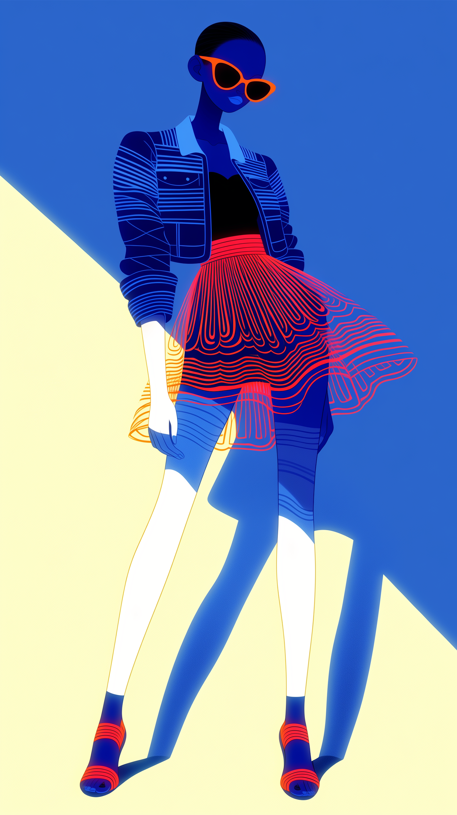 Stylized illustration of a figure in bold colors, featuring a red skirt, blue jacket, and orange sunglasses against a blue and yellow background.