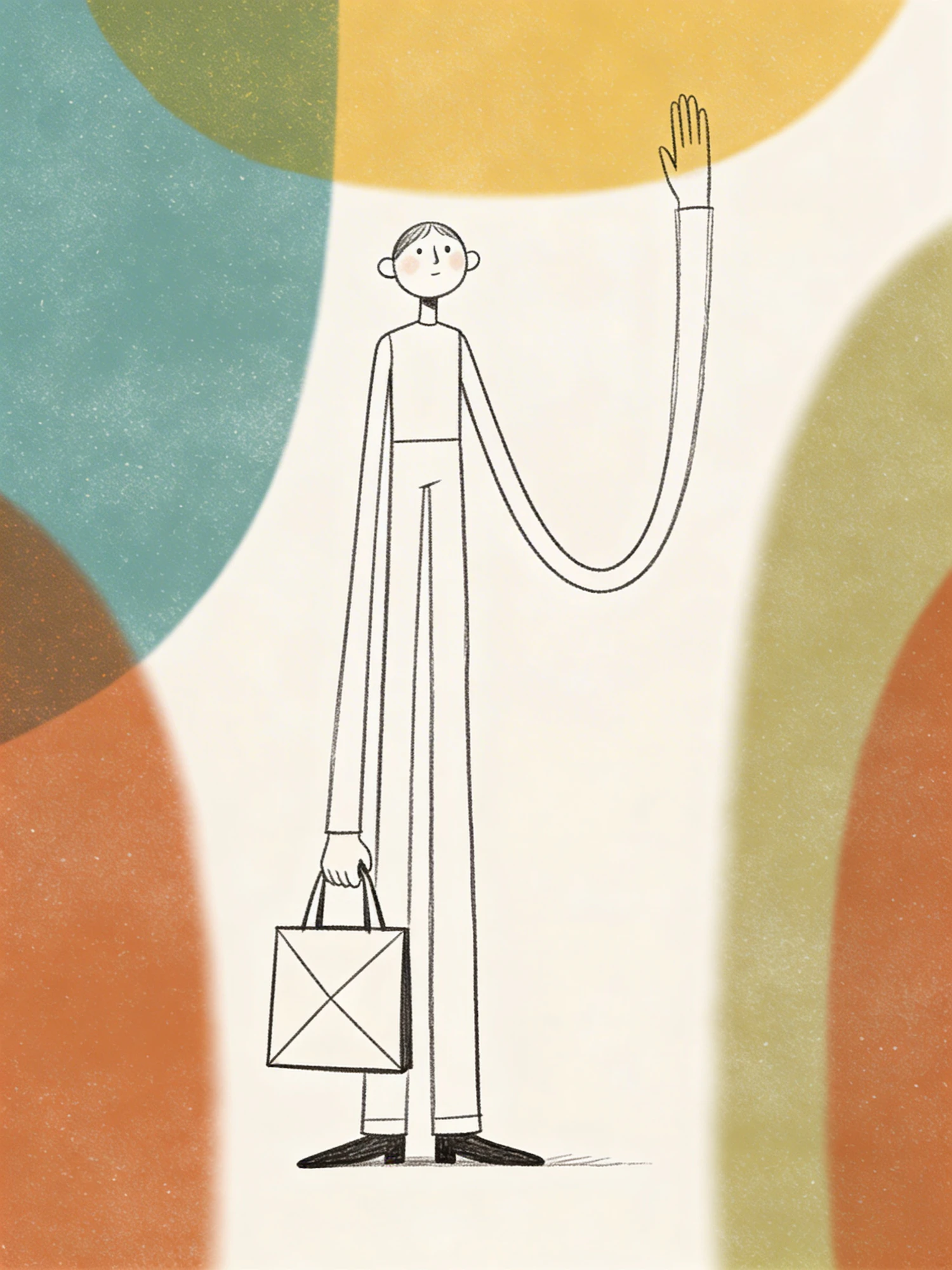 A tall, thin character standing with a simple geometric tote bag, elongated limbs, exaggeratedly long arm, rough pencil outlines, risograph grain, mid‑century modern colours, playful editorial style.