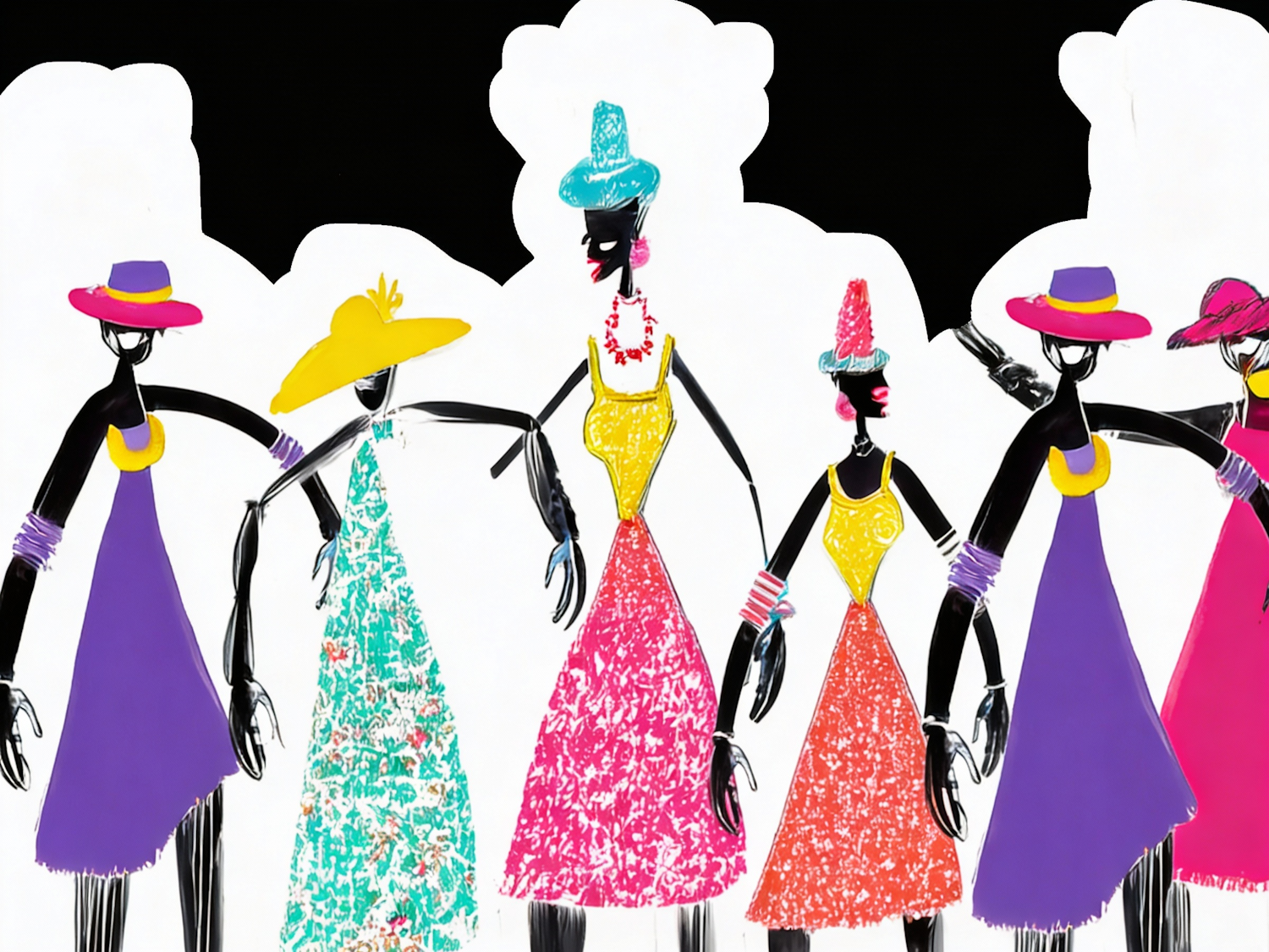 A vibrant illustration of stylized figures in colorful dresses and hats, set against a stark white background for a striking effect.