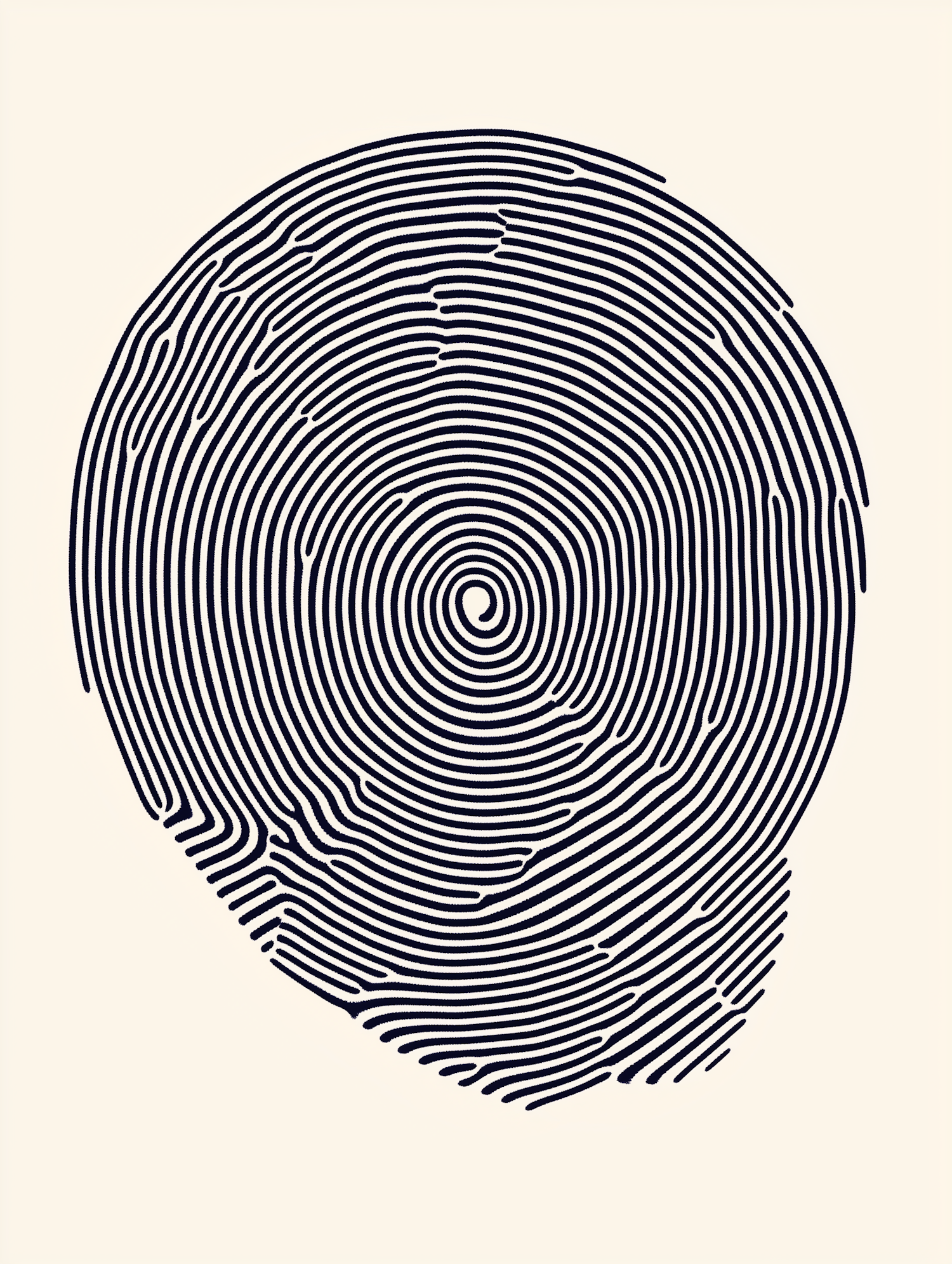 Stylized fingerprint design with intricate black lines on a beige background, creating a bold and striking visual effect.