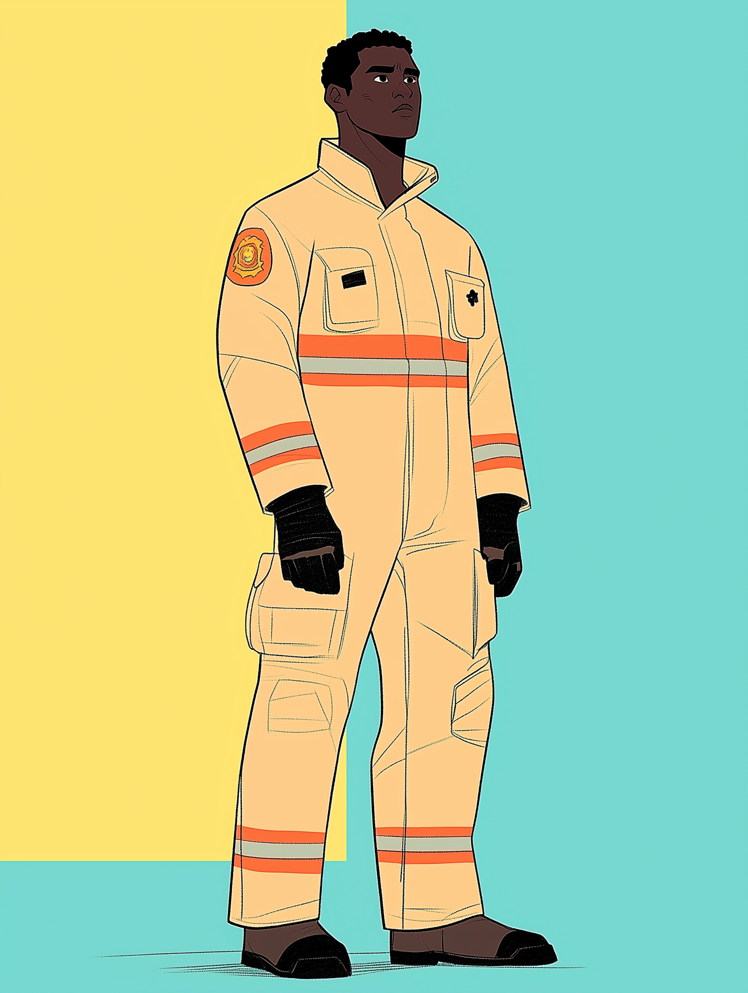 Illustration of a firefighter in a beige uniform with orange stripes, set against a pastel yellow and teal background.