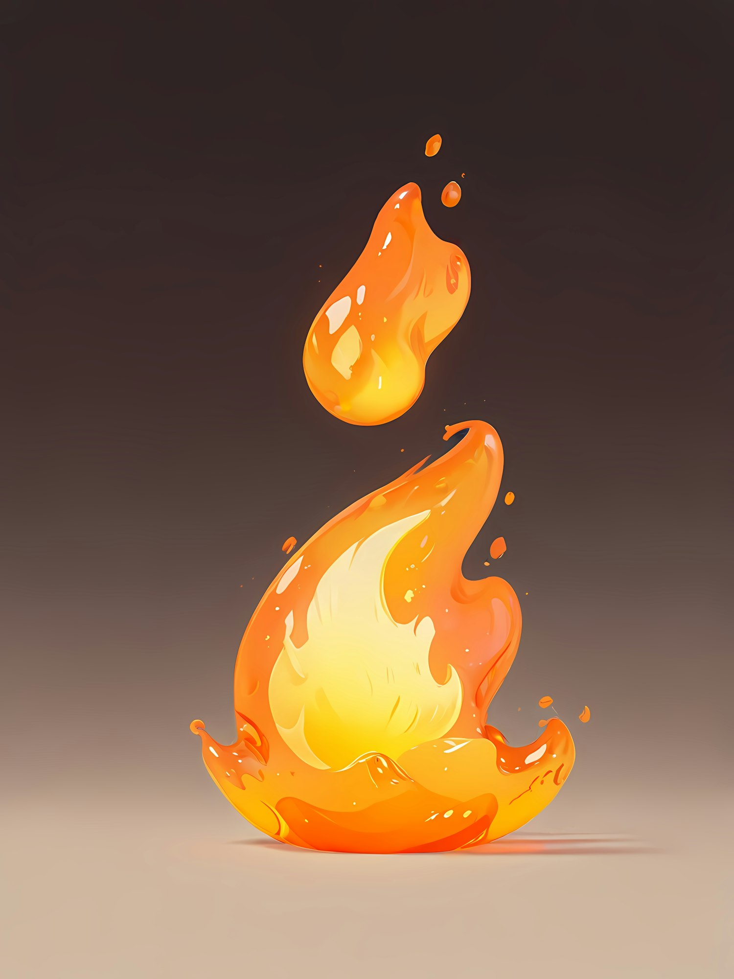 Stylized flame illustration with glowing orange and yellow hues, featuring a liquid-like droplet effect on a gradient background.