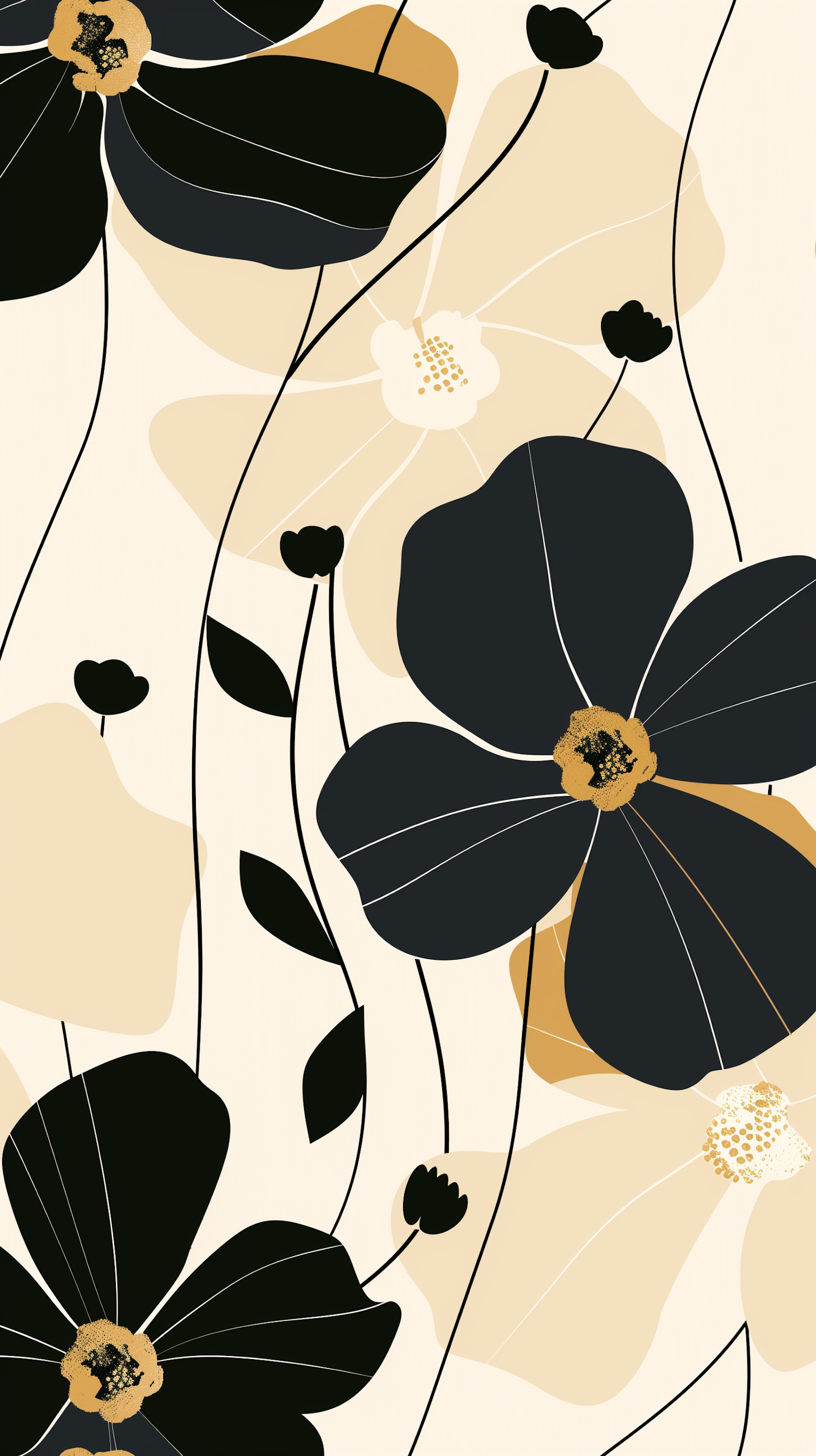 Modern floral illustration with bold black petals, golden centers, and a soft beige background. Perfect for elegant and minimalistic decor.
